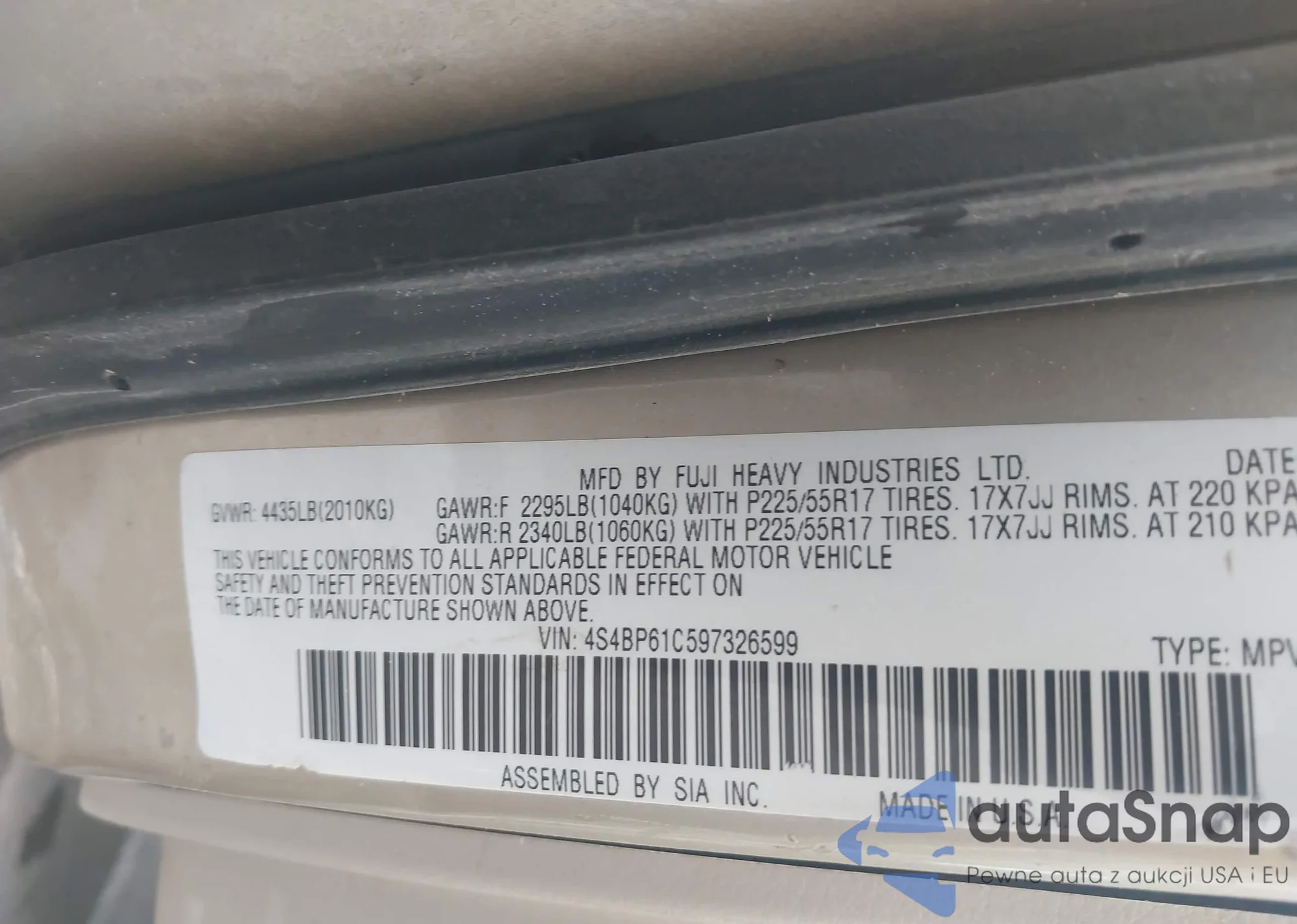 • VIN 4S4BP61C597326599
