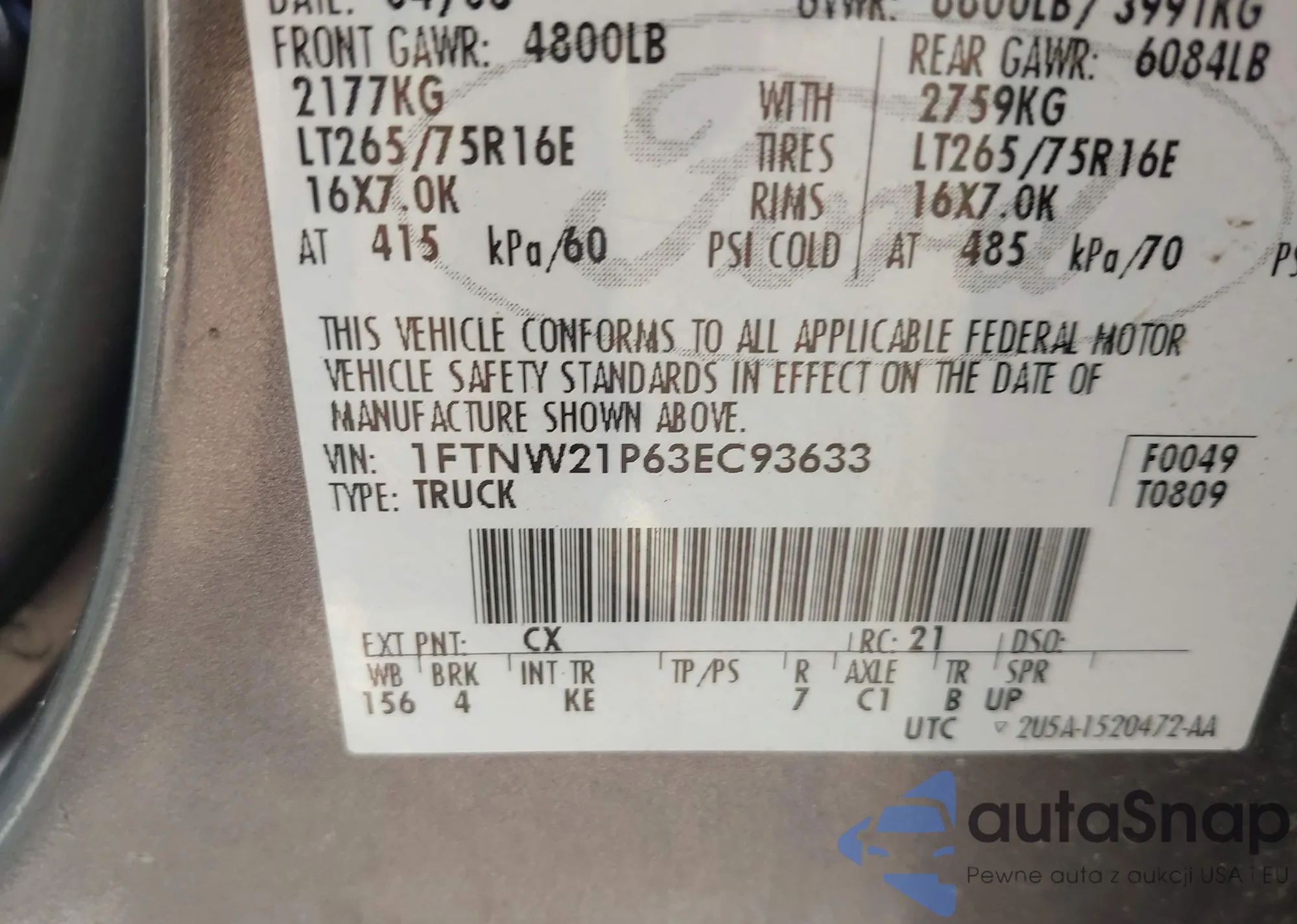 LOT: 43809899 VIN: 1FTNW21P63EC93633