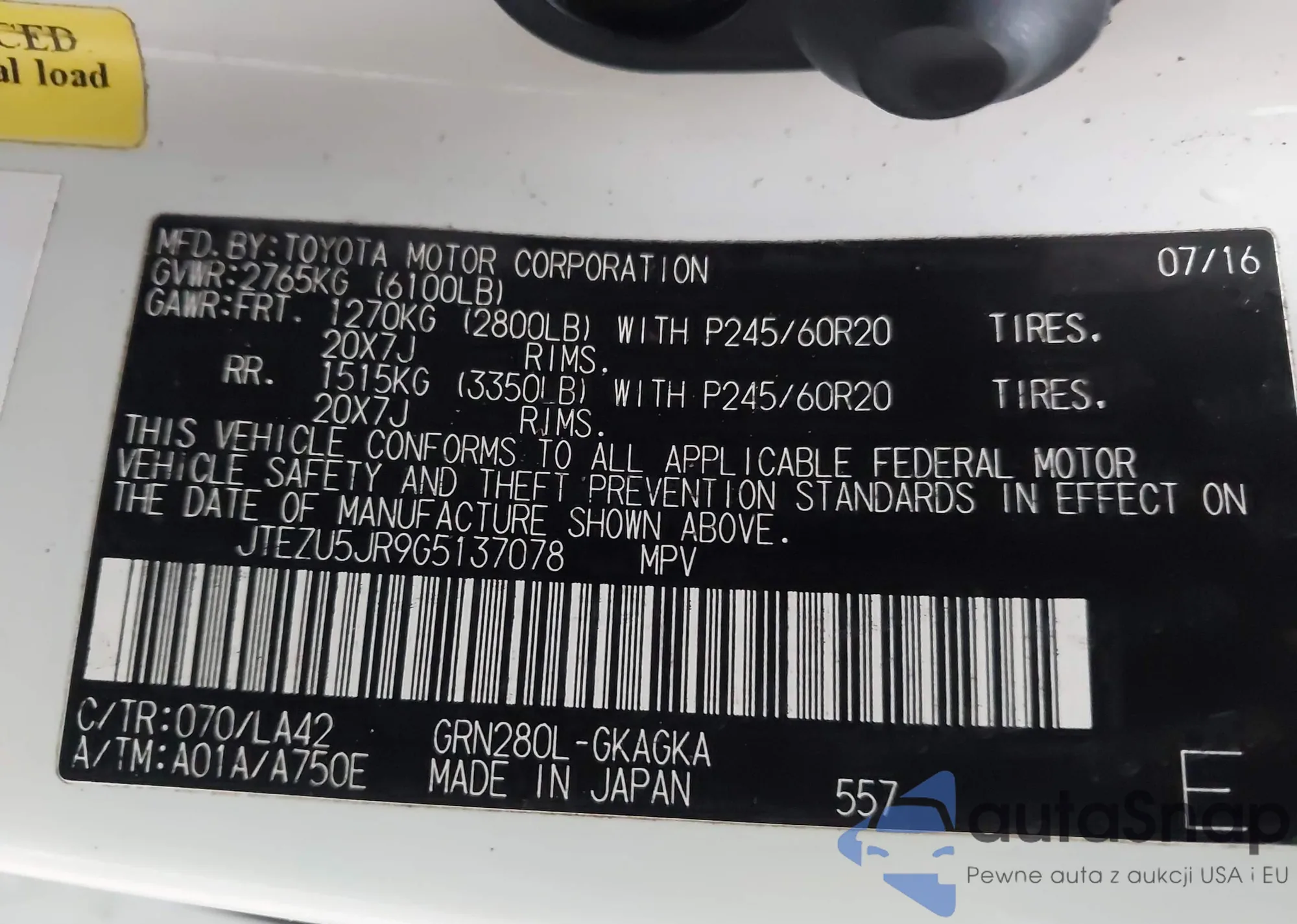 LOT: 43814731 VIN: JTEZU5JR9G5137078