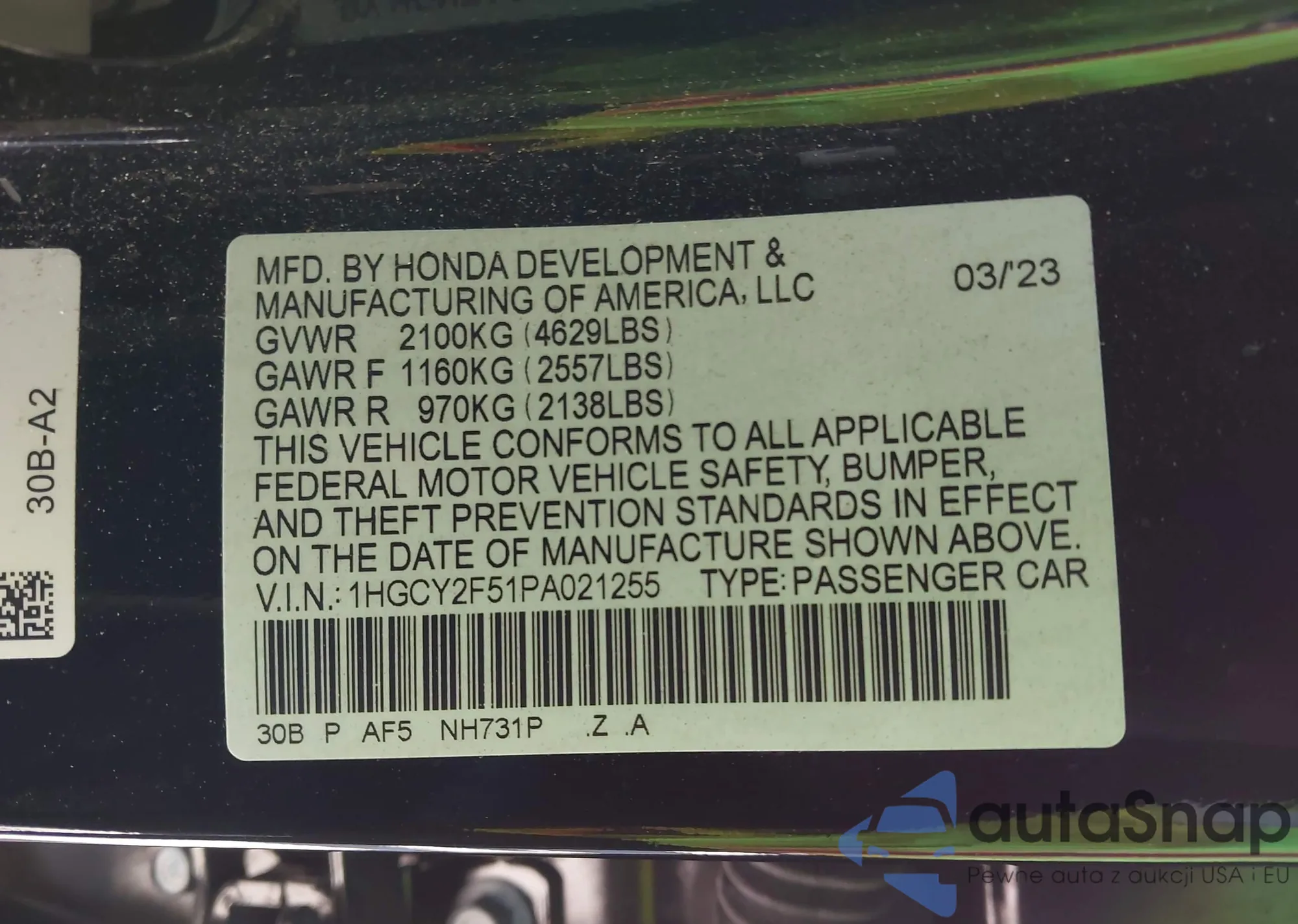 LOT: 43894329 VIN: 1HGCY2F51PA021255
