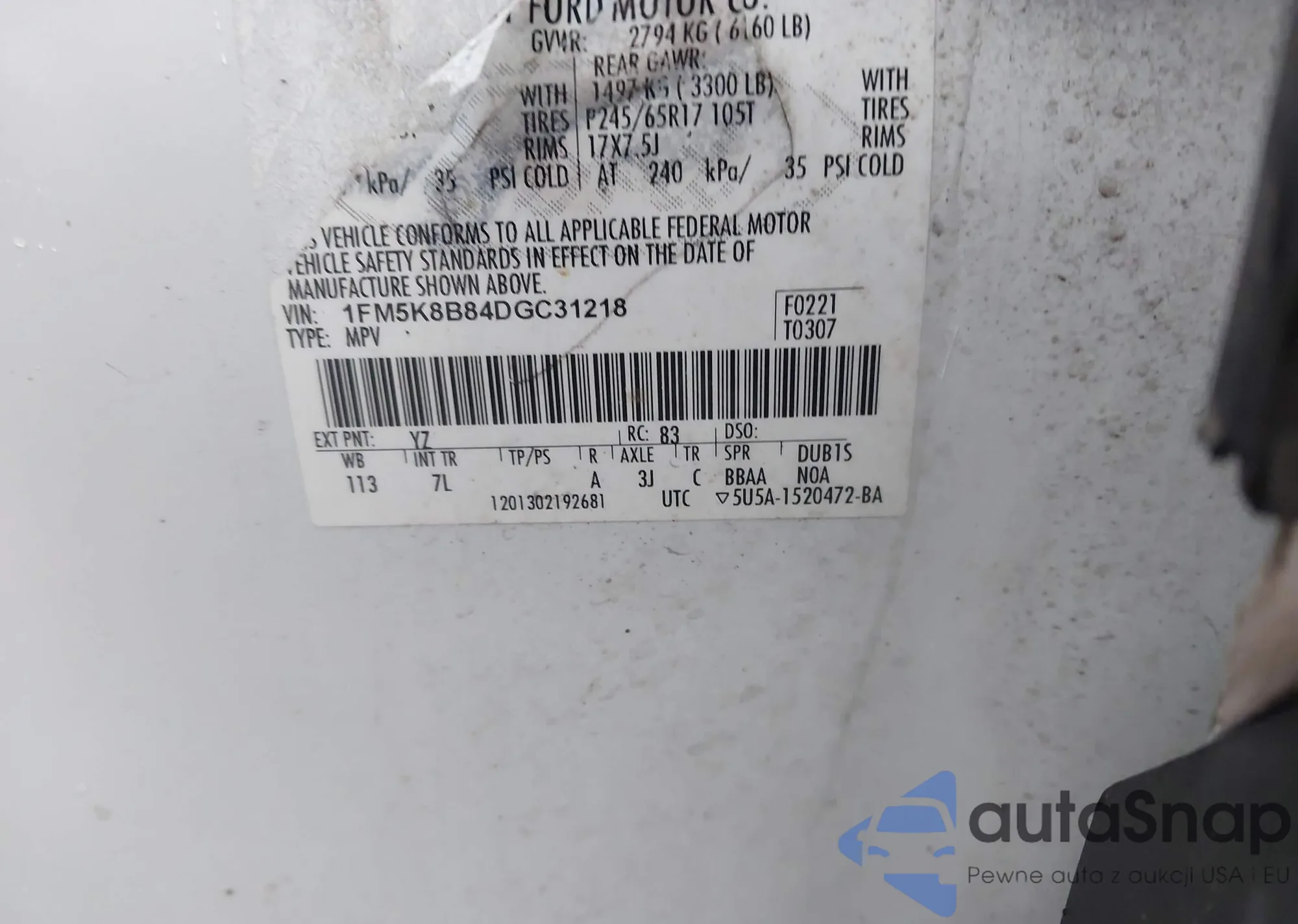 LOT: 37466218 VIN: 1FMSK7DH6LGA10874