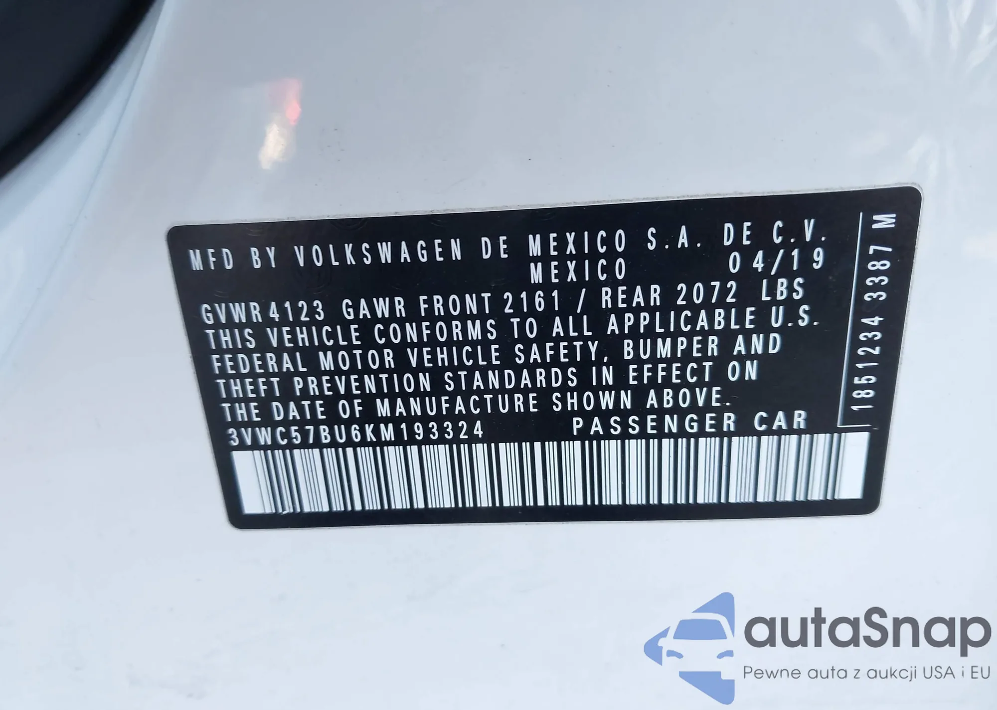 • VIN 3VWC57BU6KM193324