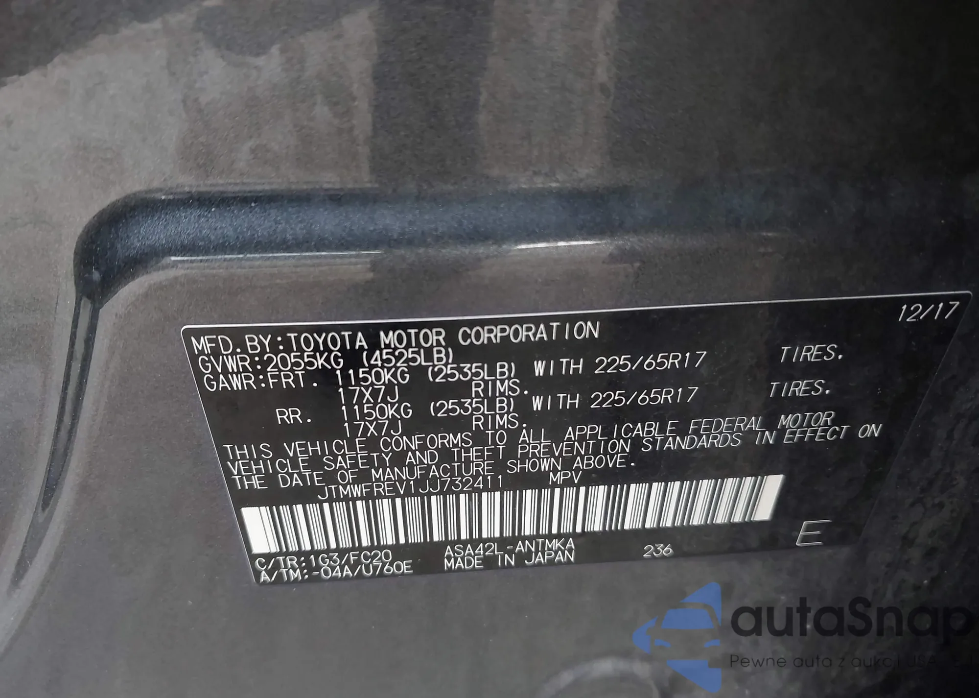 LOT: 43715098 VIN: JTMWFREV1JJ732411