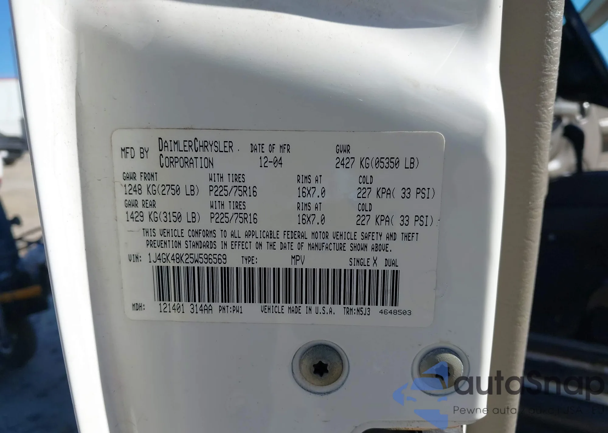 LOT: 43705972 VIN: 1J4GK48K25W596569