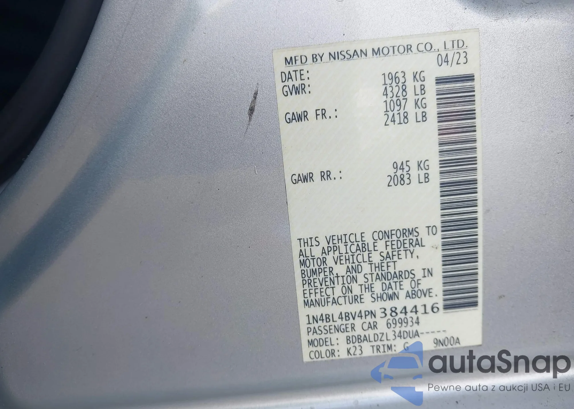 LOT: 43761047 VIN: 1N4BL4BV4PN384416