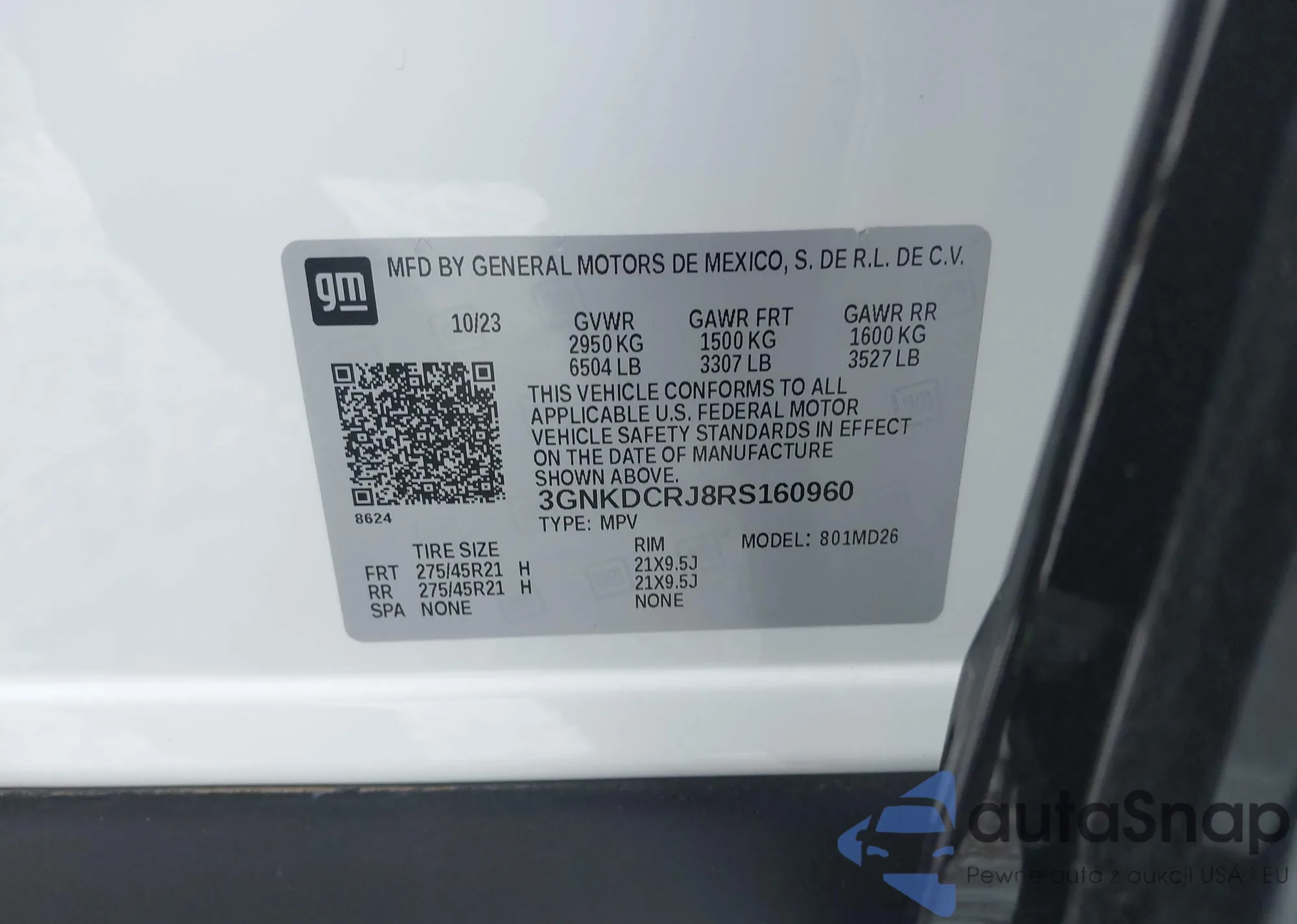 • VIN 3GNKDCRJ8RS160960