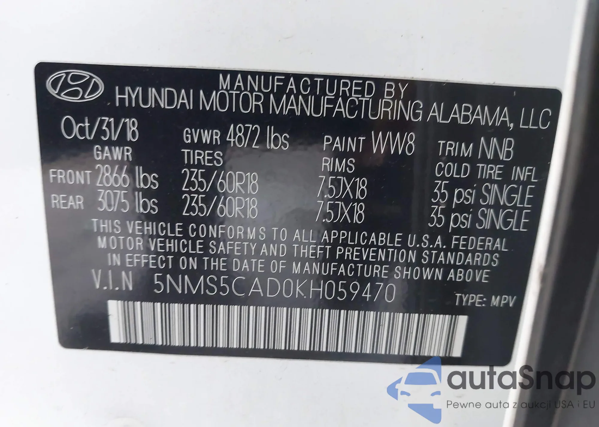 LOT: 43629497 VIN: 5NMS5CAD0KH059470