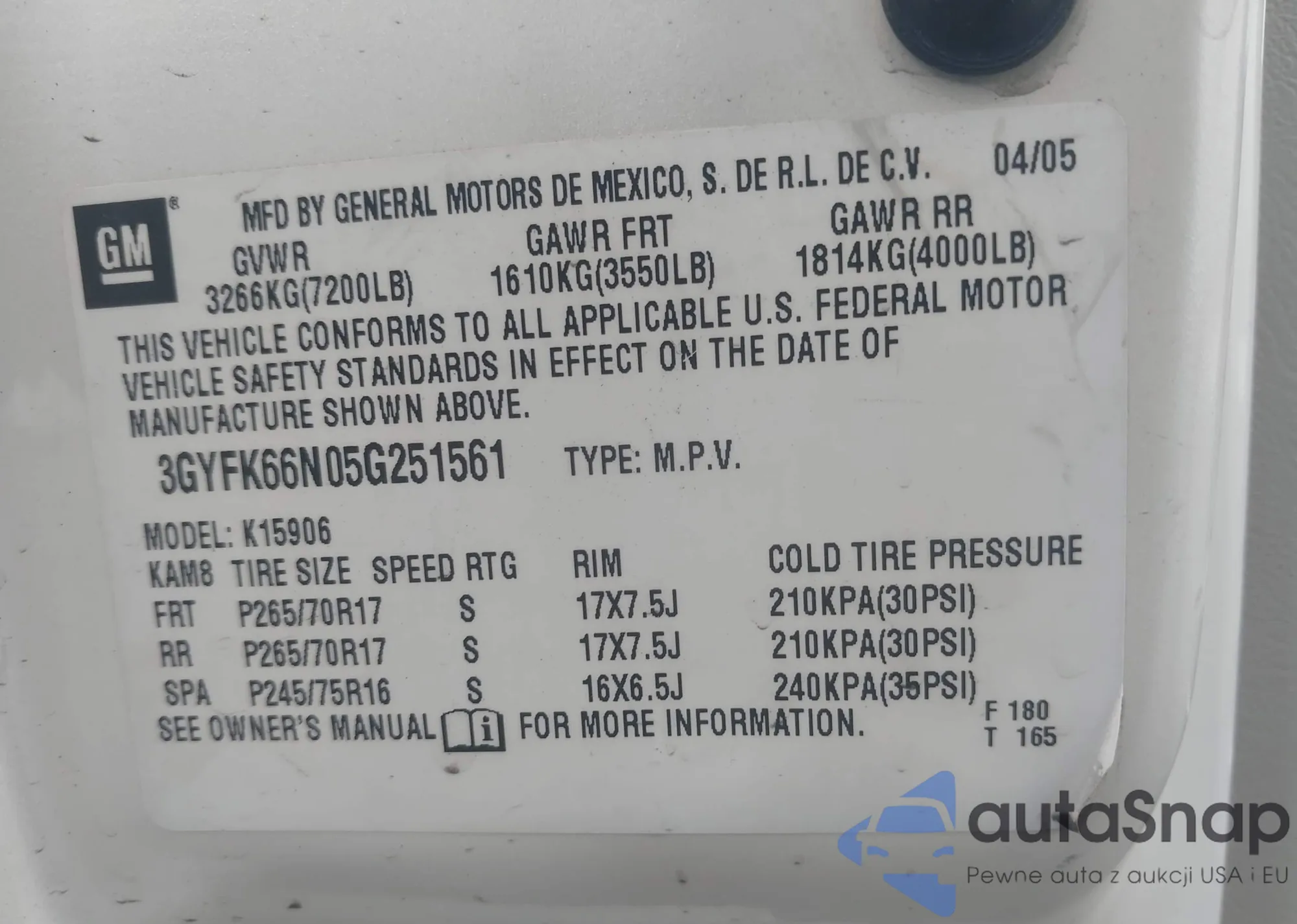 LOT: 43991175 VIN: 3GYFK66N05G251561
