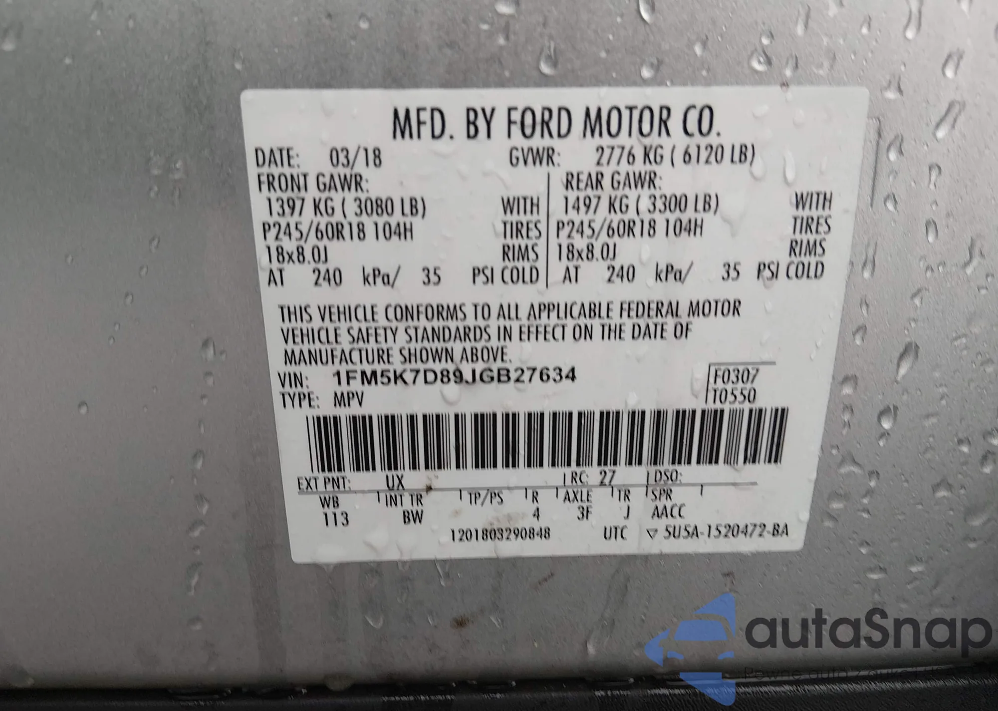 LOT: 43888575 VIN: 1FM5K7D89JGB27634
