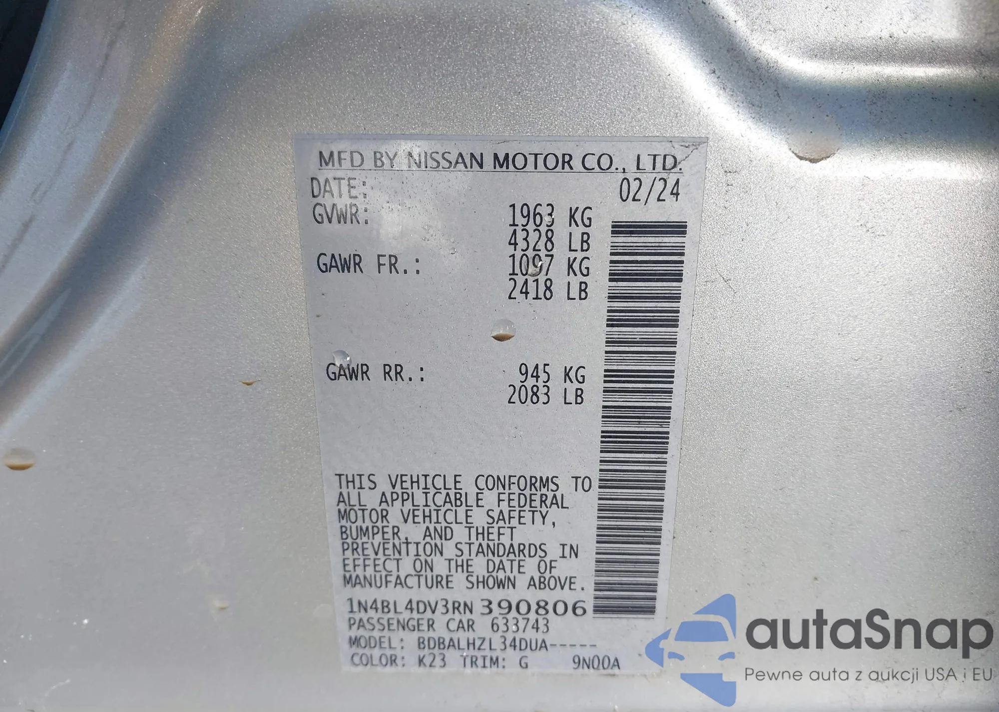 LOT: 44000437 VIN: 1N4BL4DV3RN390806