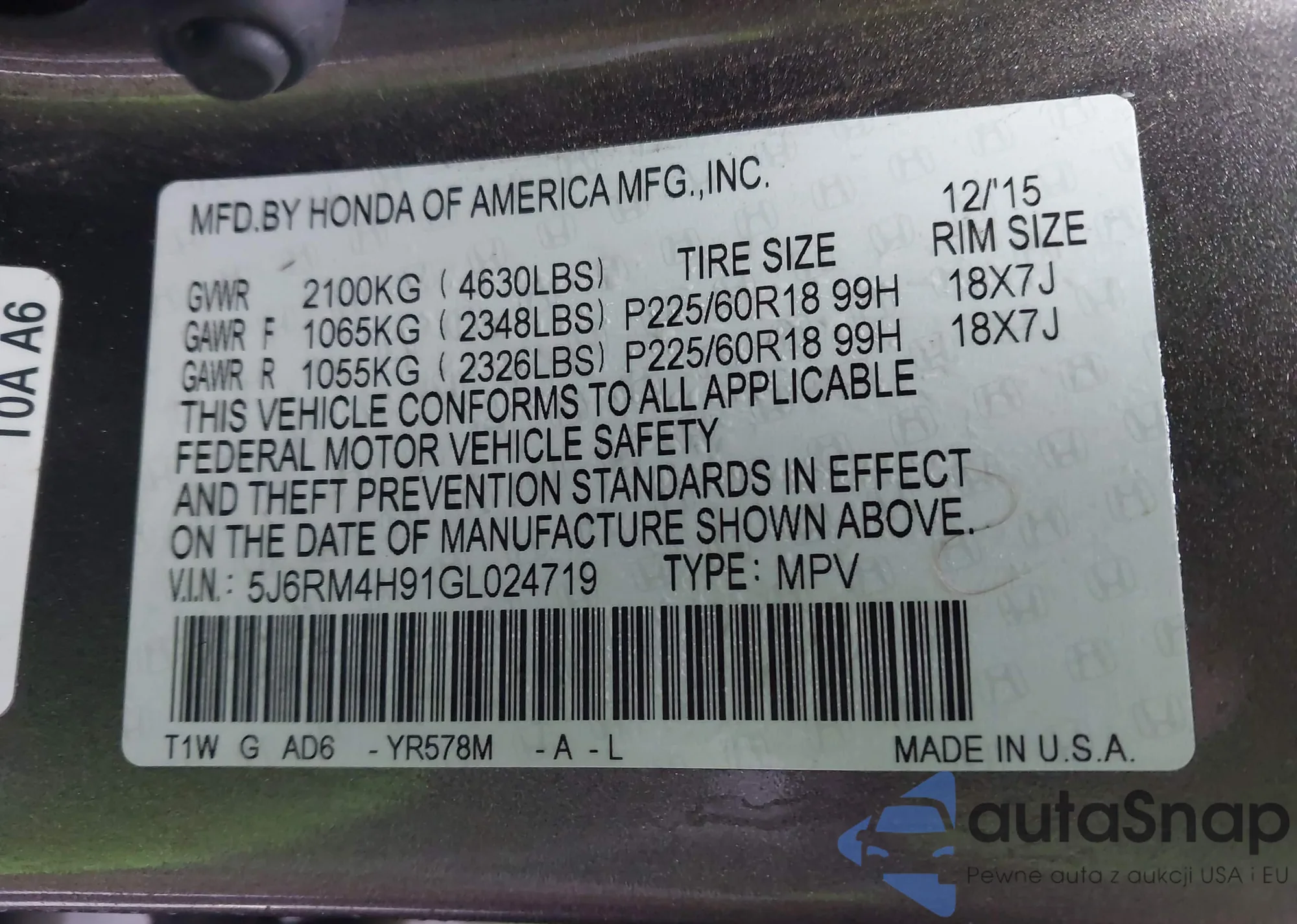 • VIN 5J6RM4H91GL024719
