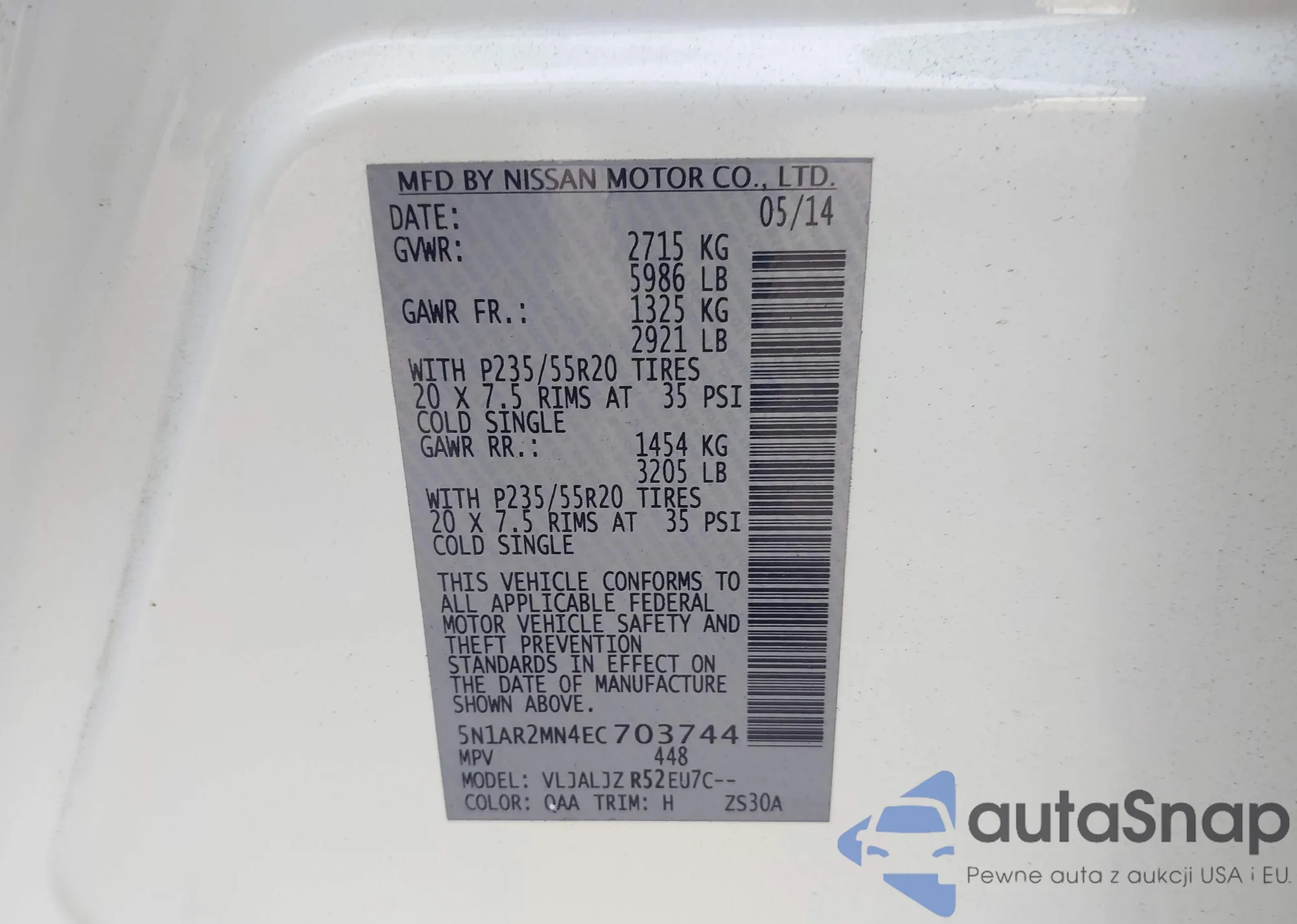 LOT: 44117196 VIN: 5N1AR2MN4EC703744