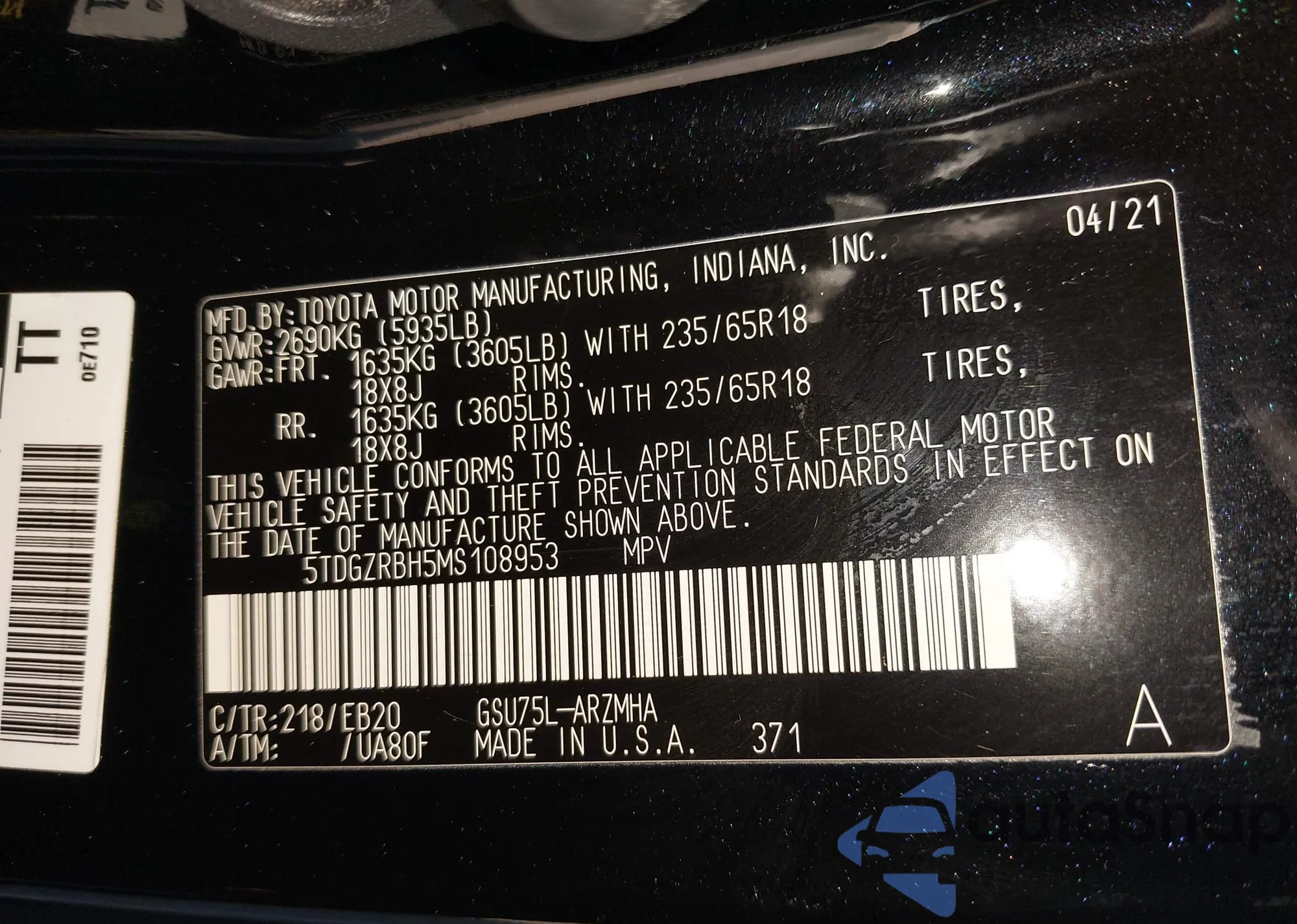 LOT: 43804342 VIN: 5TDGZRBH5MS108953
