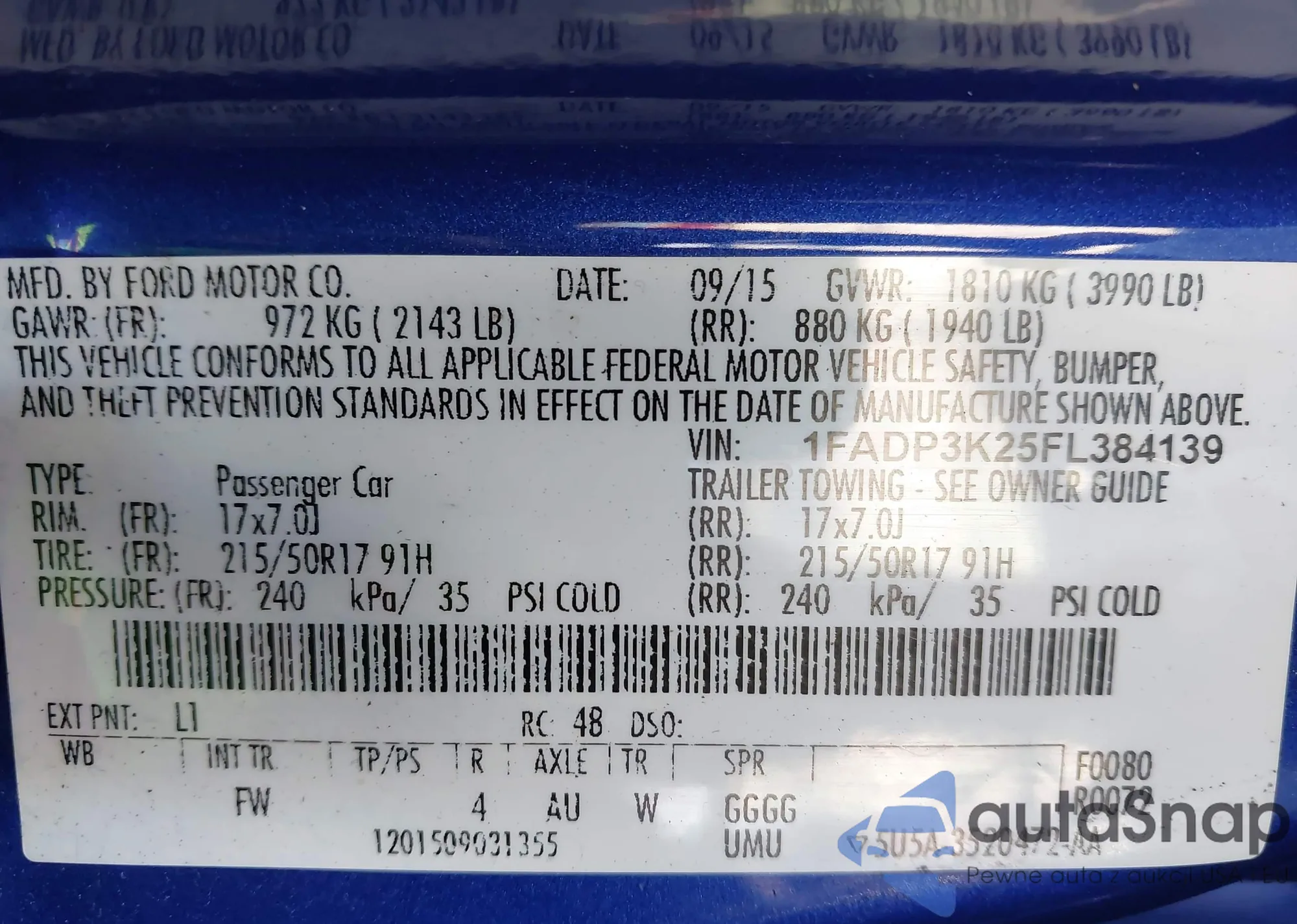 LOT: 43931179 VIN: 1FADP3K25FL384139
