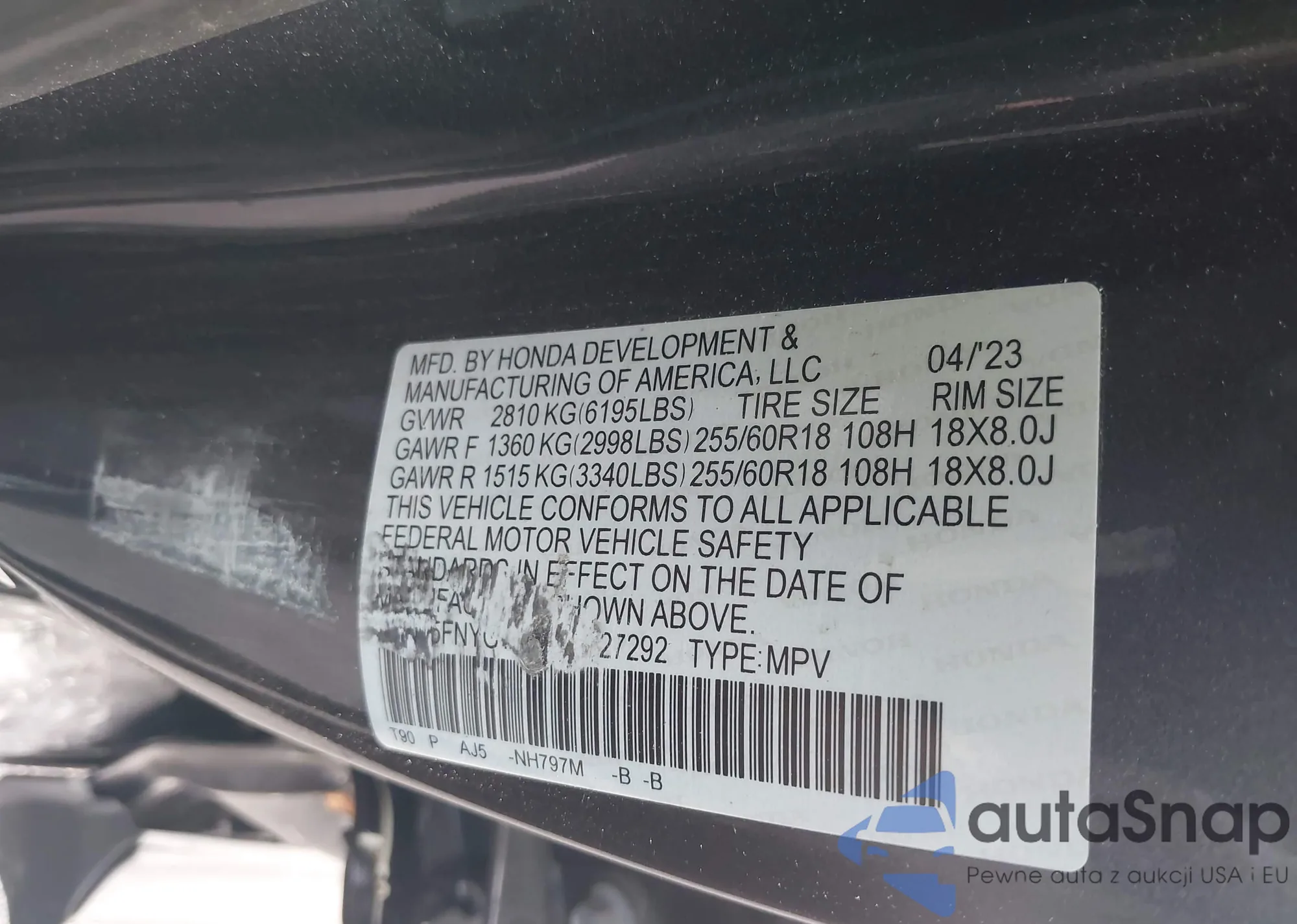 • VIN 5FNYG1H2XPB027292