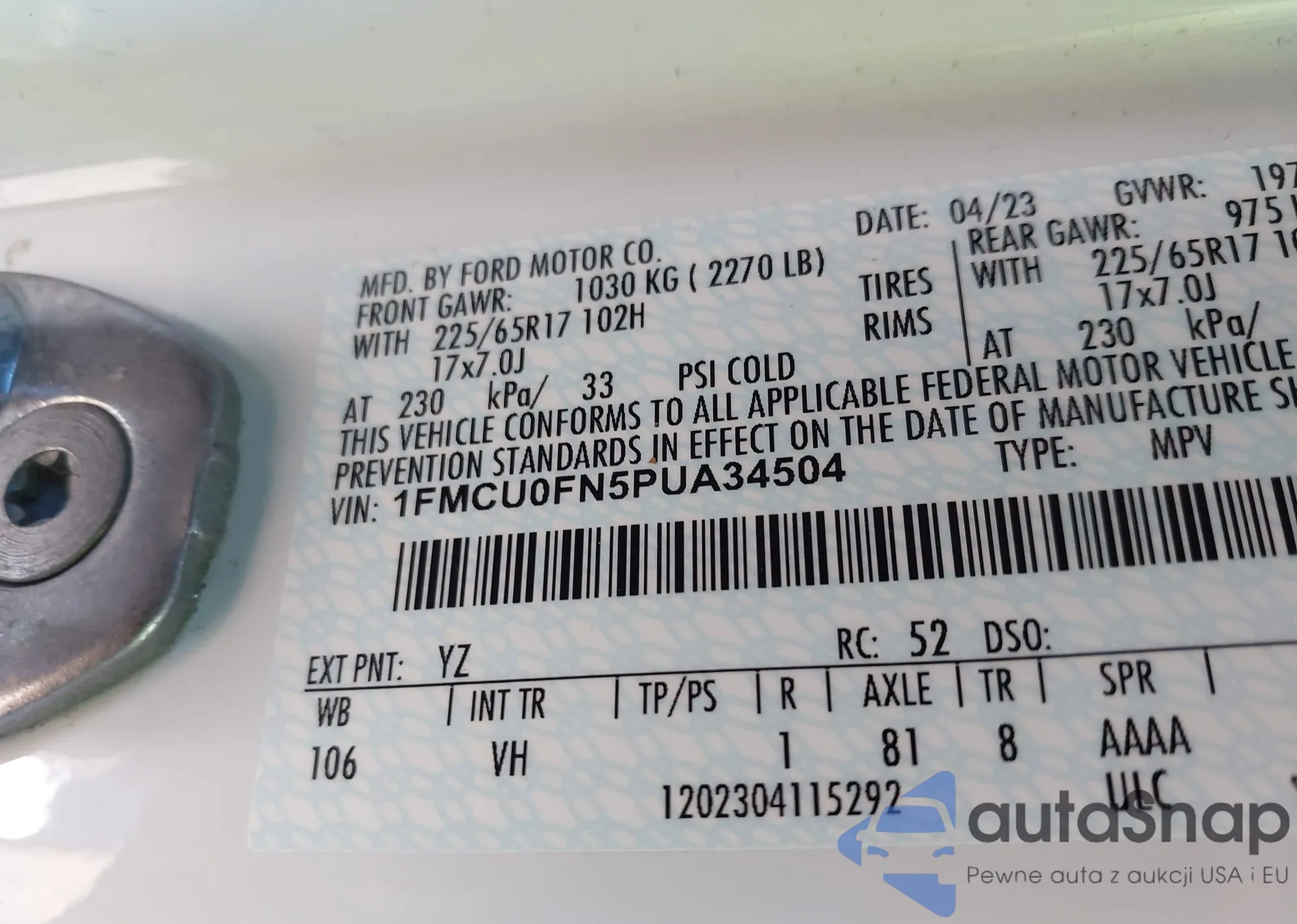 LOT: 44156440 VIN: 1FMCU0FN5PUA34504