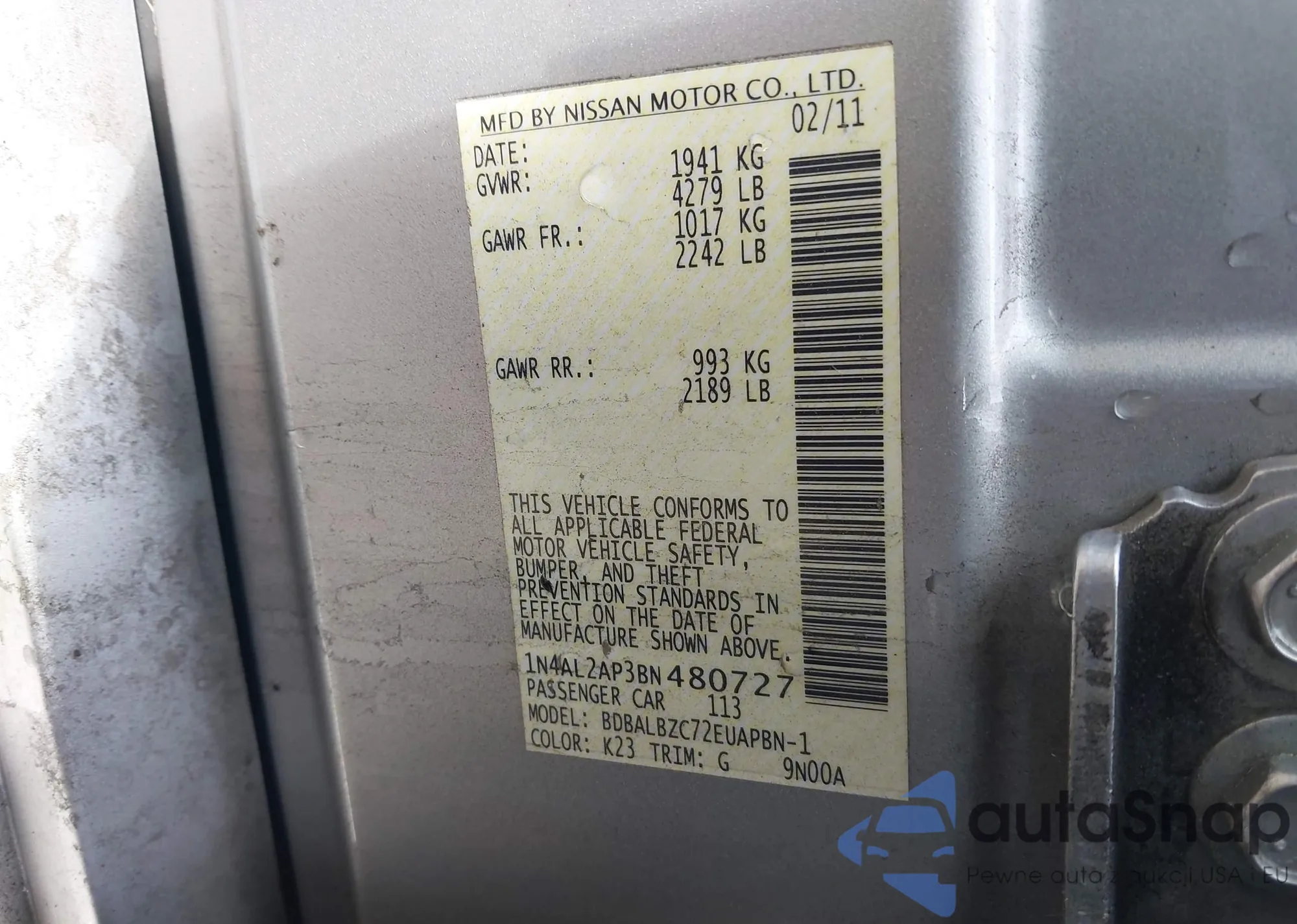 LOT: 43851171 VIN: 1N4AL2AP3BN480727