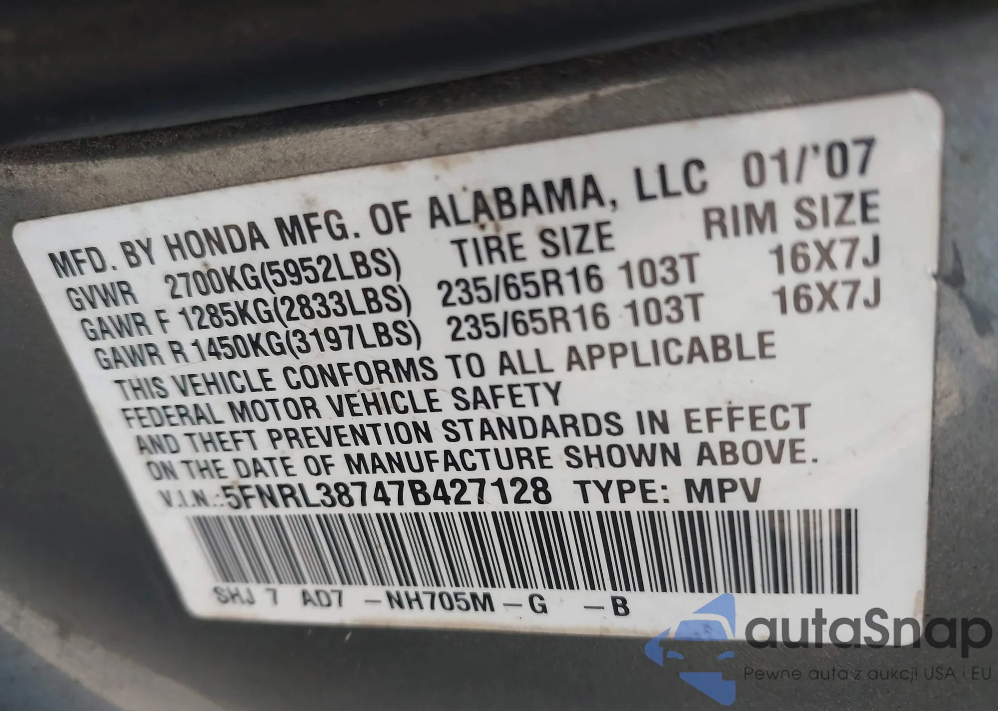 • VIN 5FNRL38747B427128