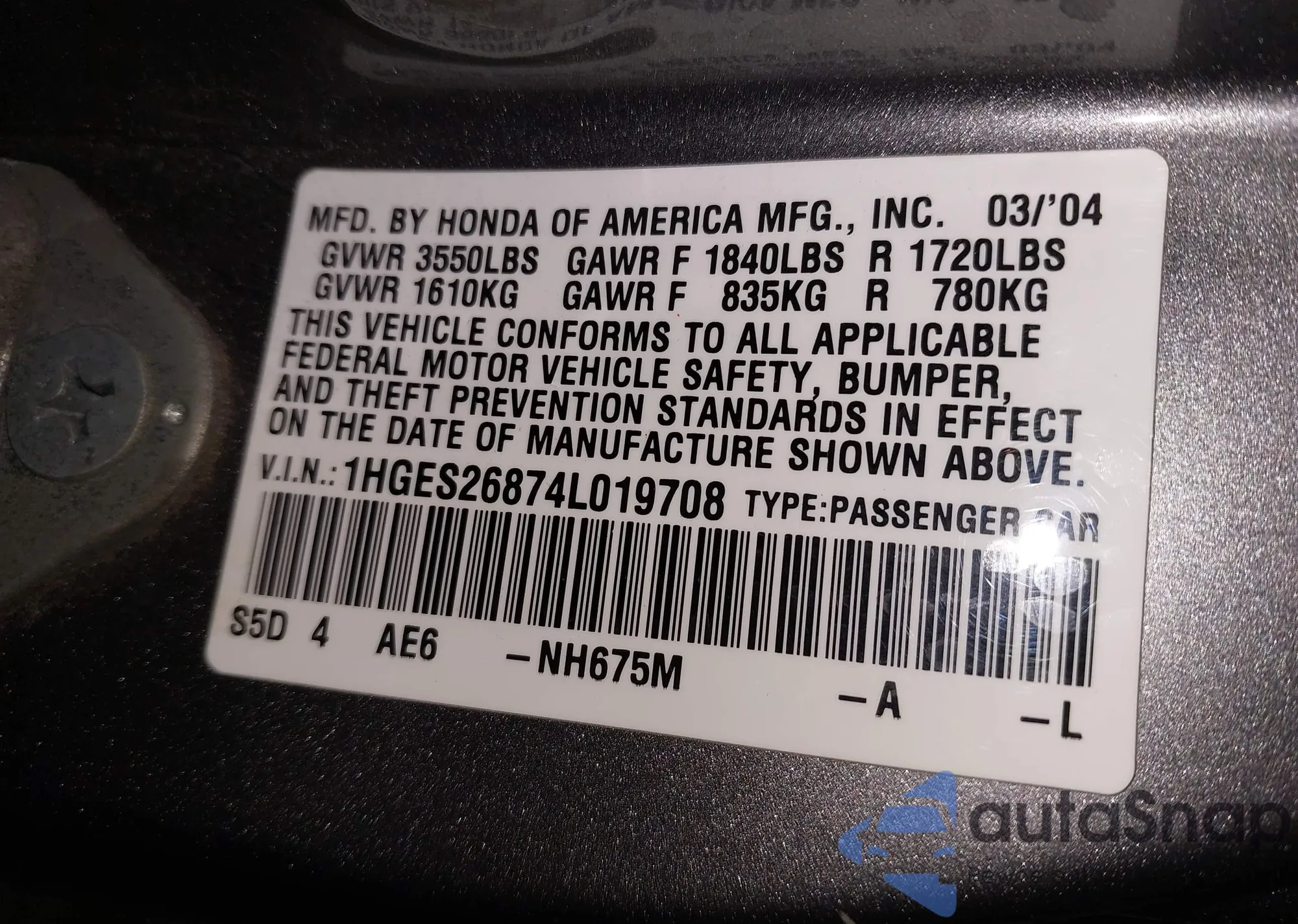 • VIN 1HGES26874L019708