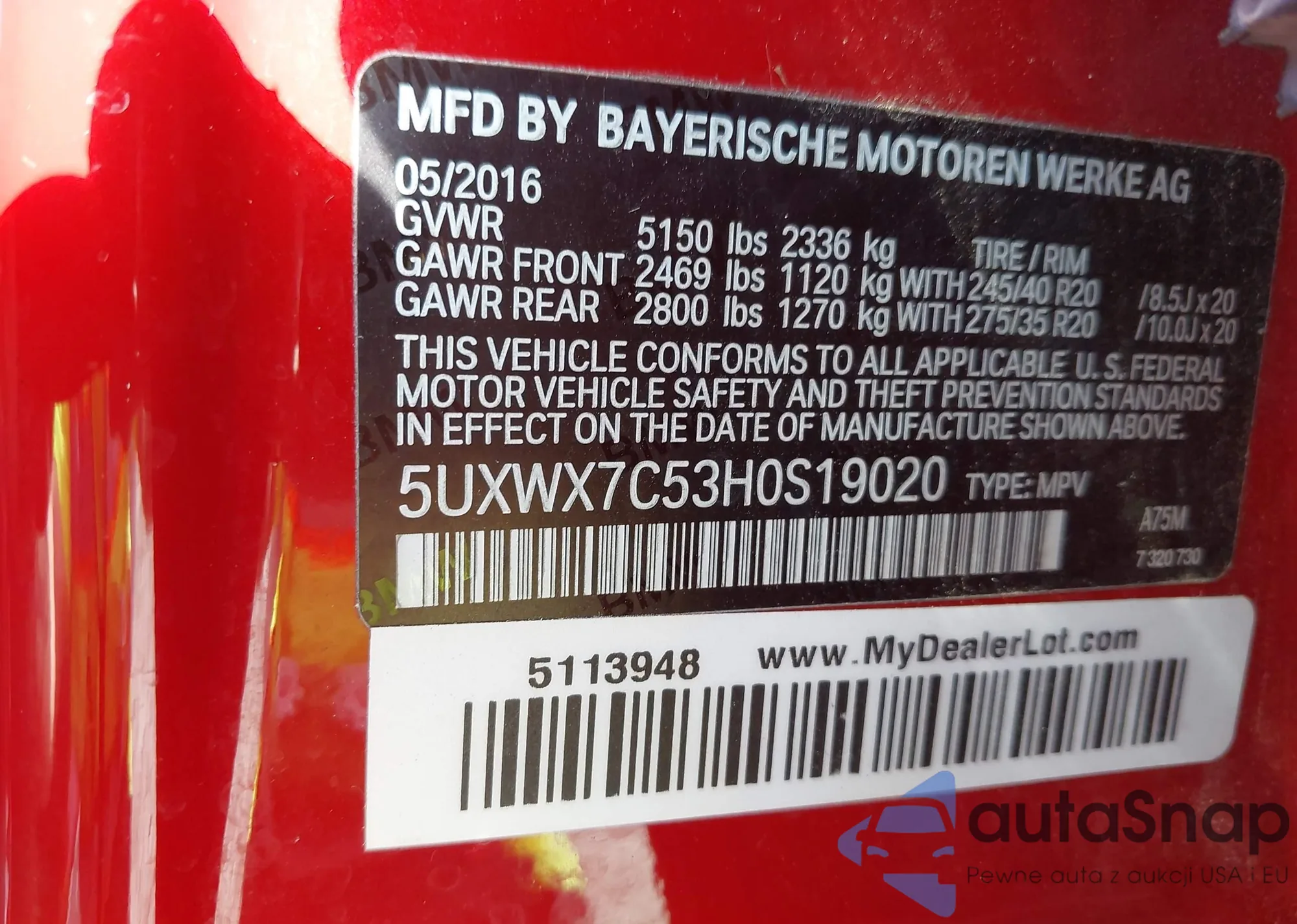 LOT: 44104928 VIN: 5UXWX7C53H0S19020