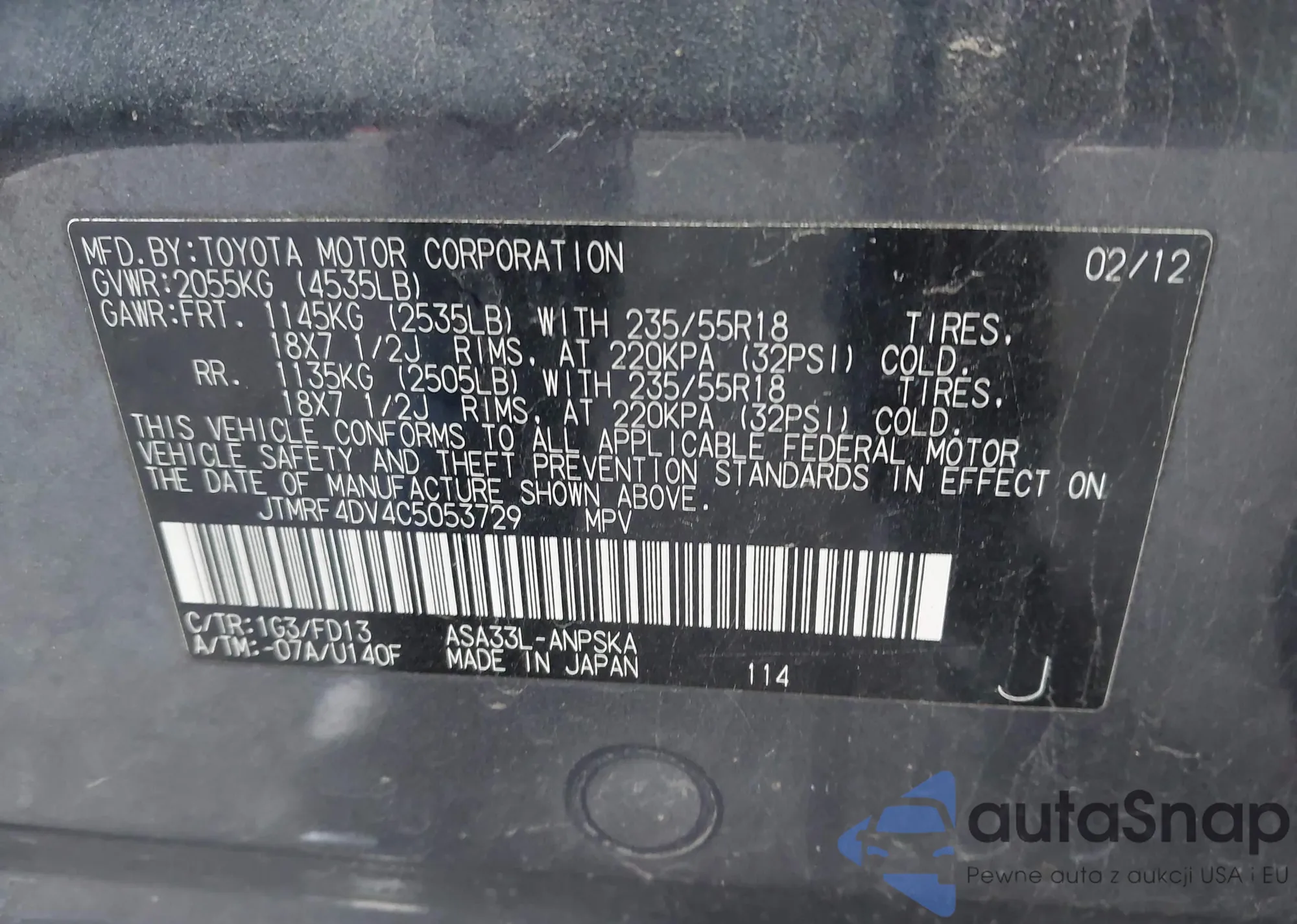 LOT: 43808992 VIN: JTMRF4DV4C5053729