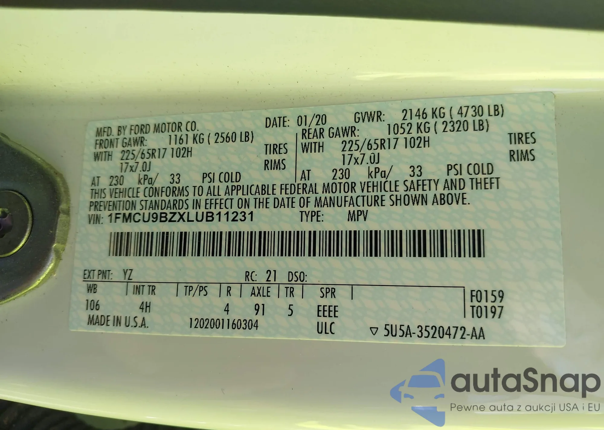 • VIN 1FMCU9BZXLUB11231