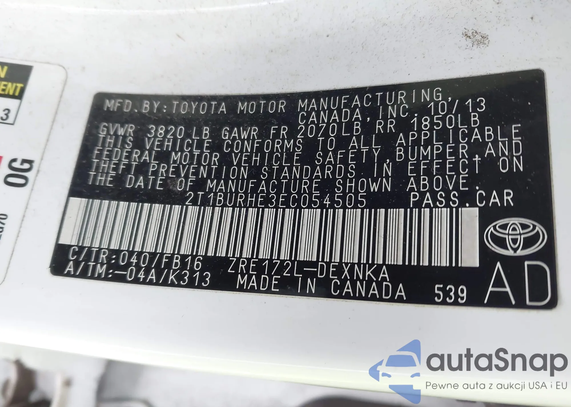 LOT: 44180024 VIN: 2T1BURHE3EC054505