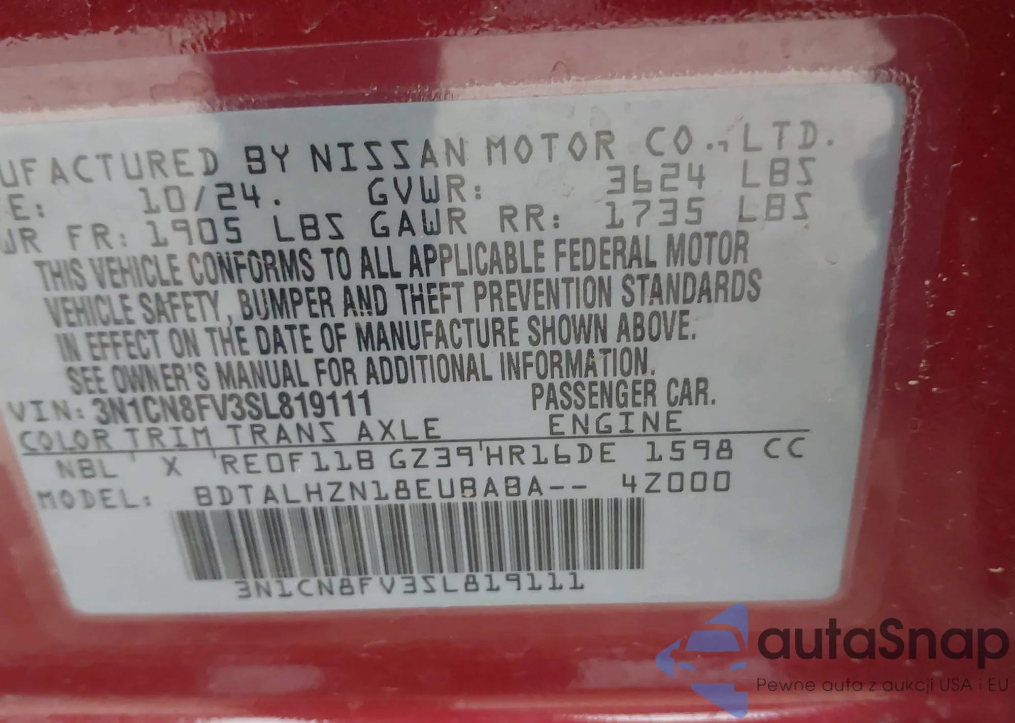 • VIN 1N4BL4DW2SN355110