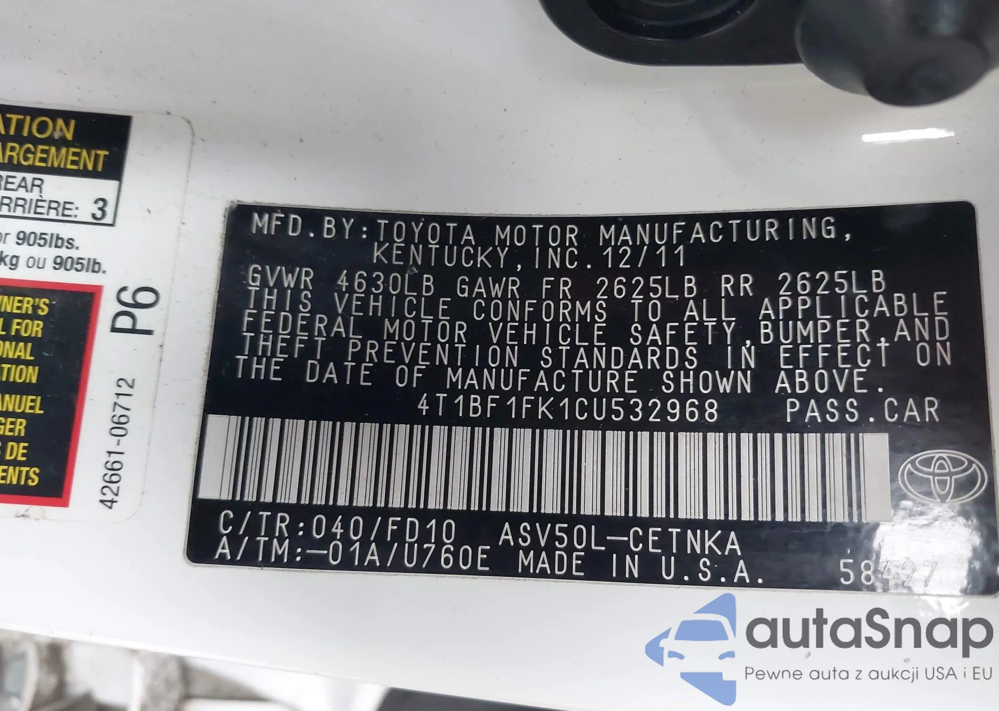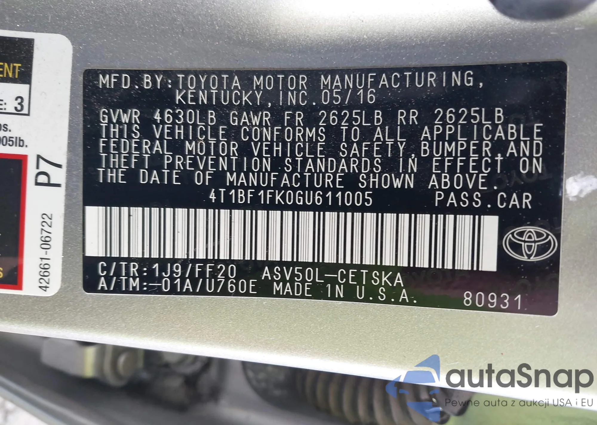• VIN 4T1BF1FK0GU611005