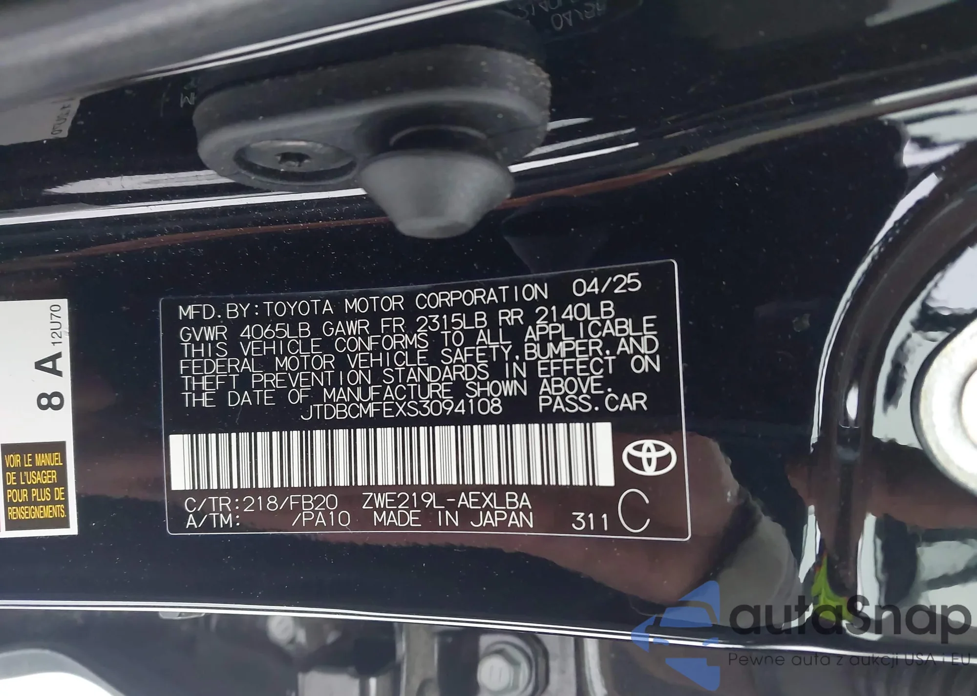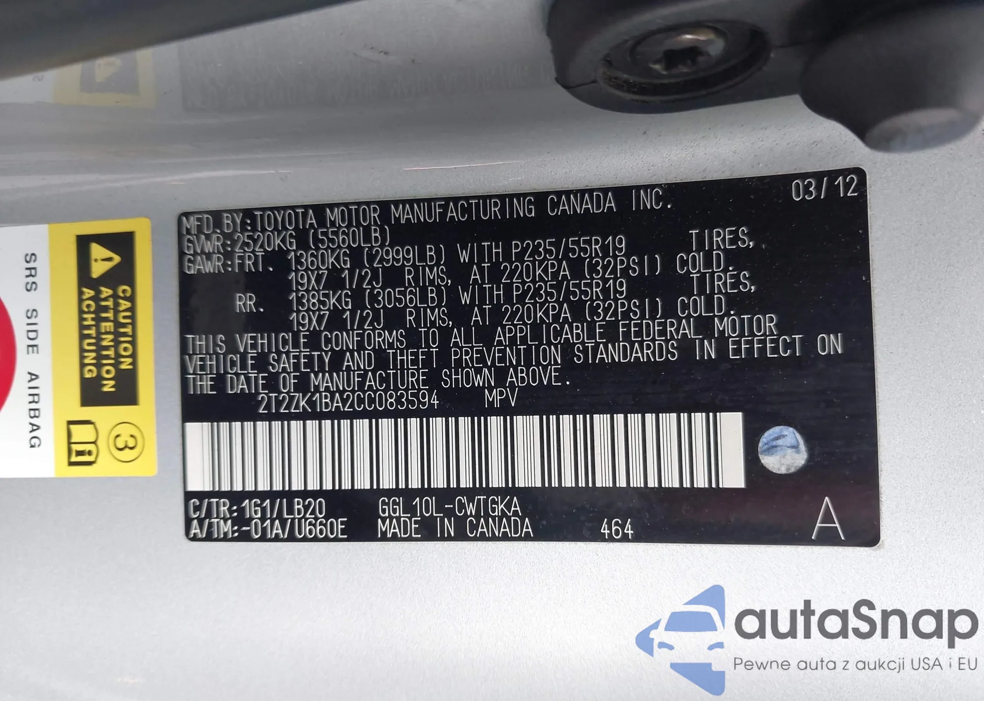 • VIN 2T2ZK1BA2CC083594