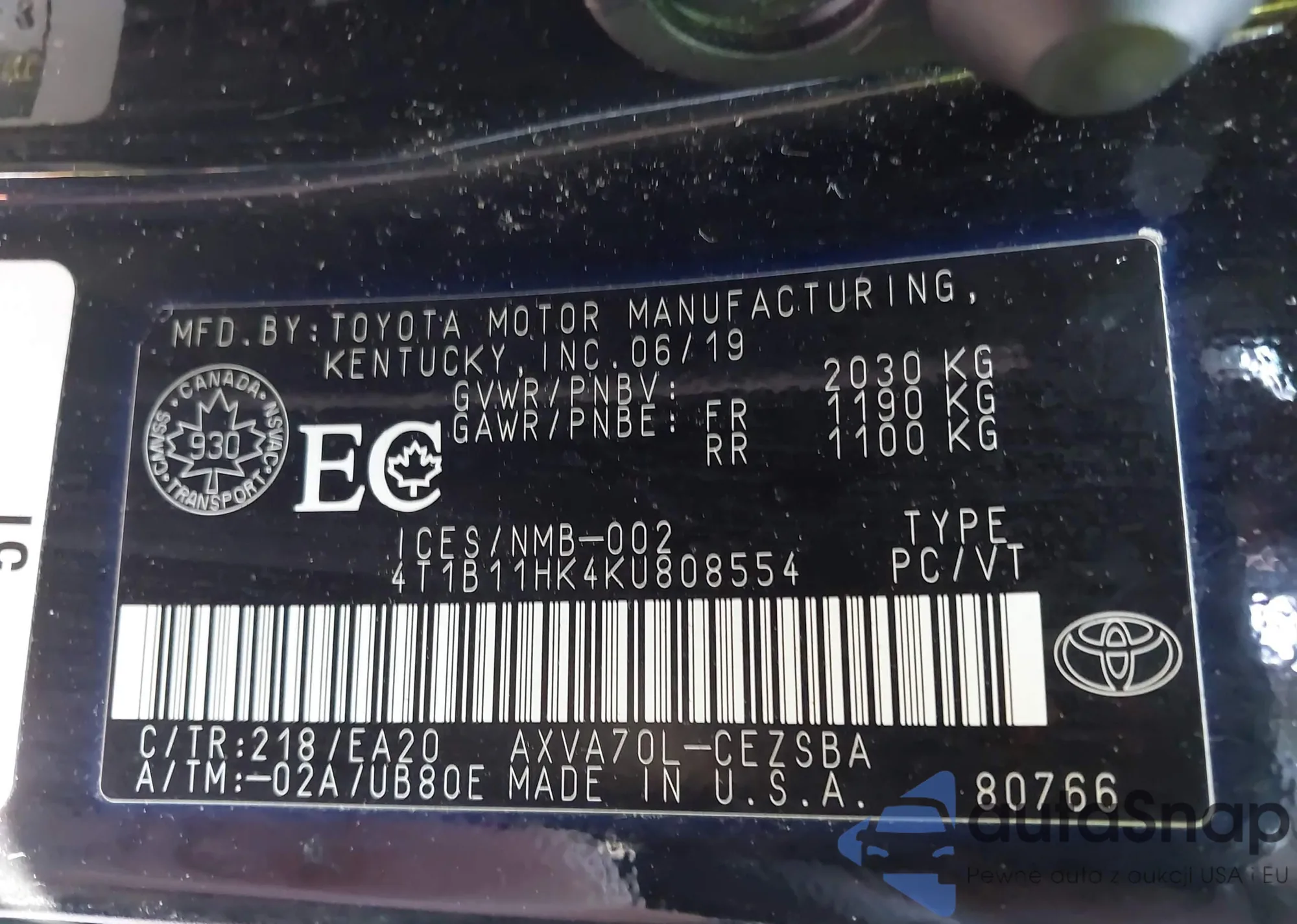 • VIN 4T1B11HK4KU808554