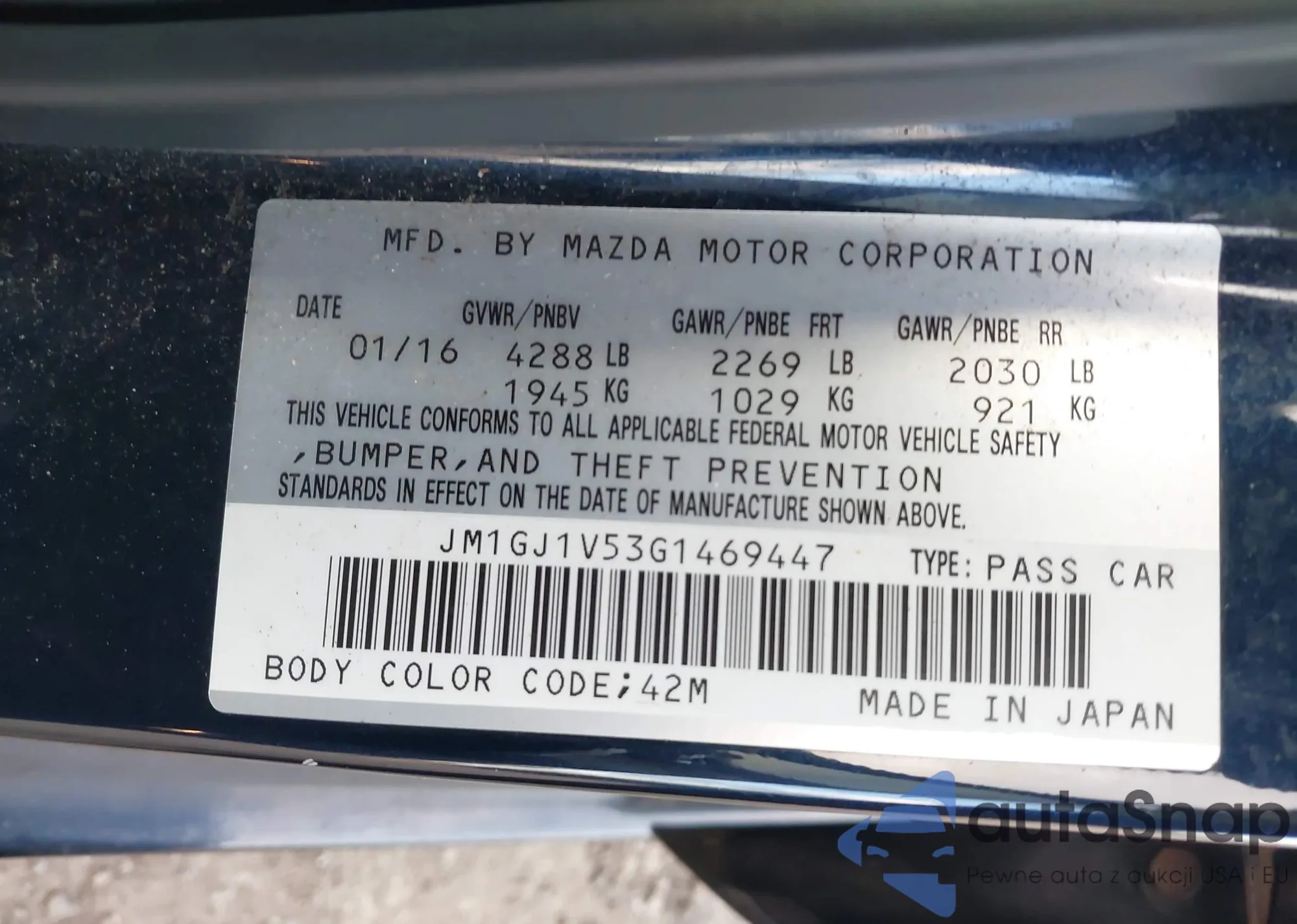 LOT: 43353316 VIN: JM1GJ1V53G1469447