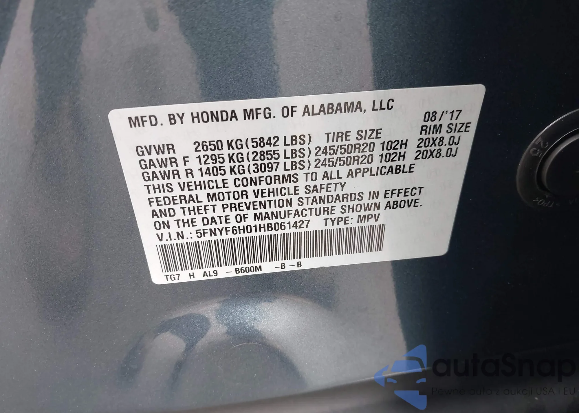 LOT: 42444571 VIN: 5FNYF6H01HB061427