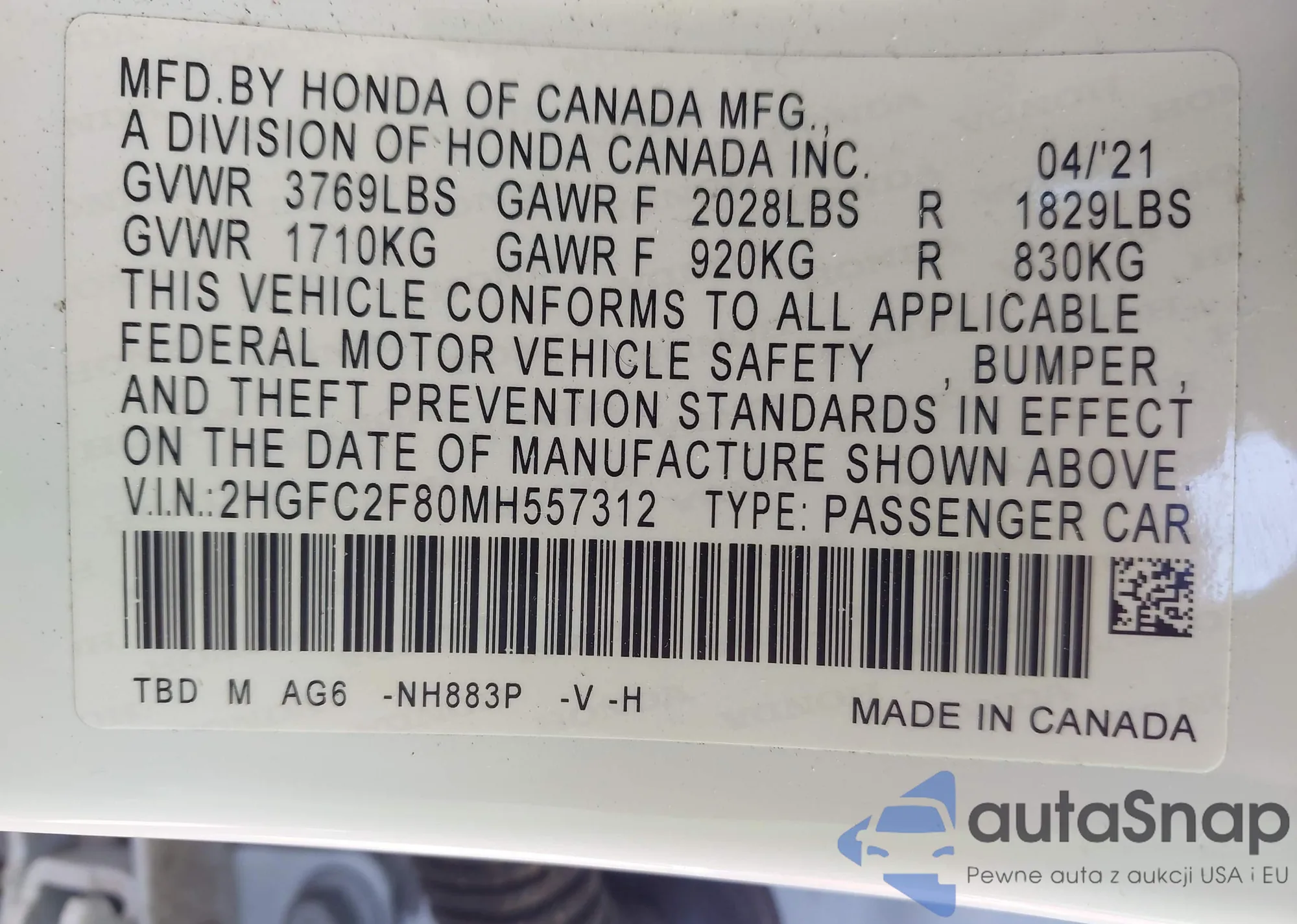• VIN 2HGFC2F80MH557312