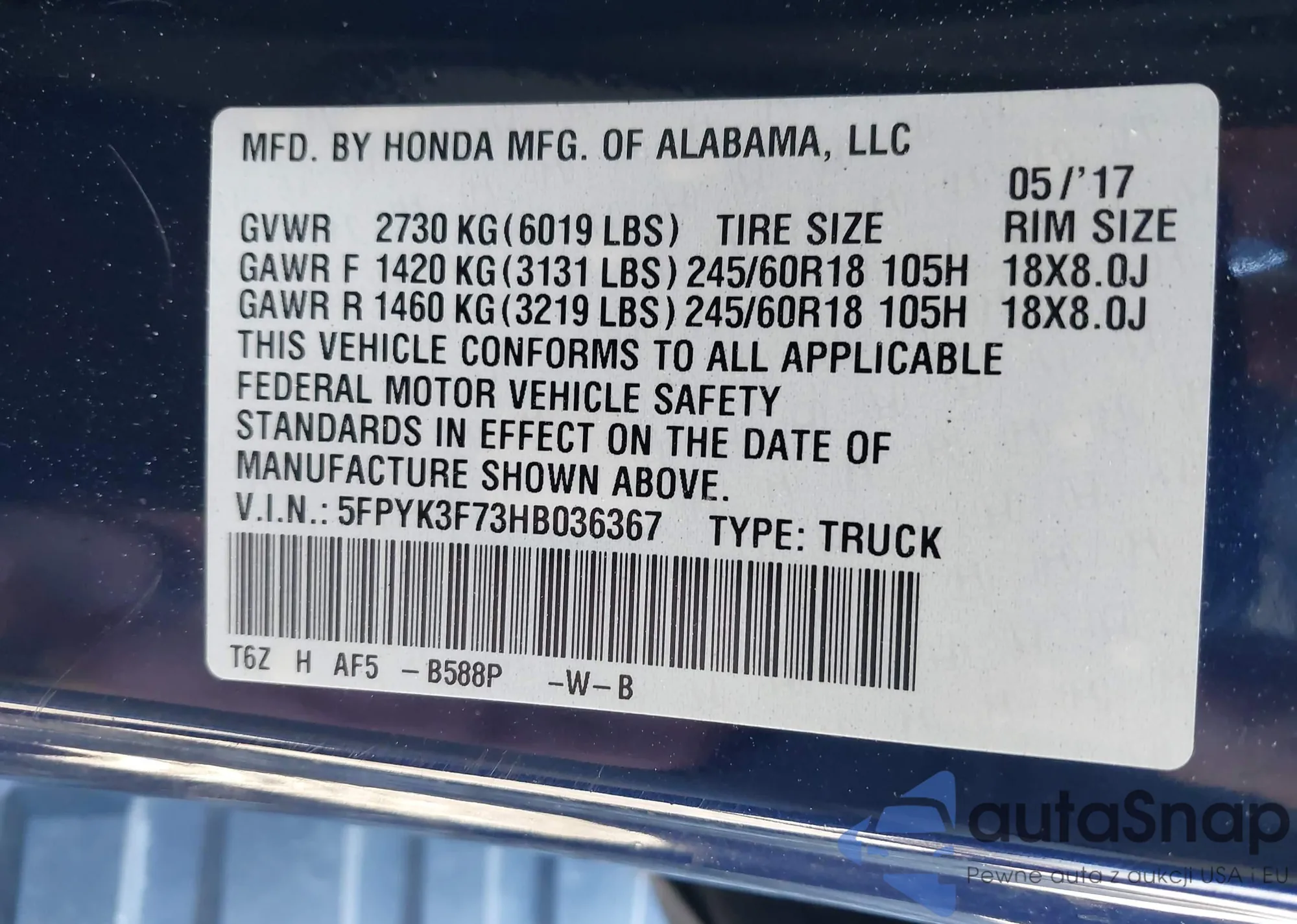 • VIN 5FPYK3F73HB036367