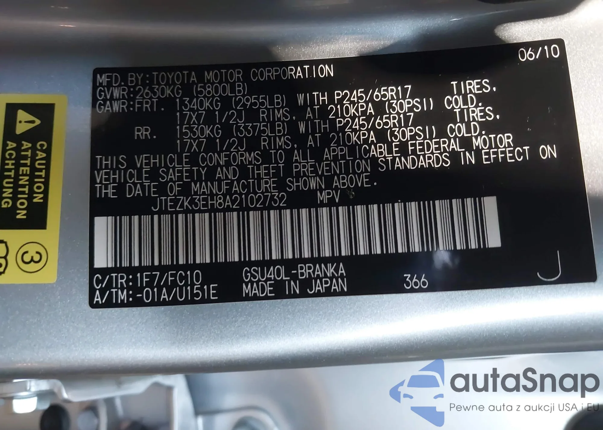 LOT: 44043405 VIN: JTEZK3EH8A2102732