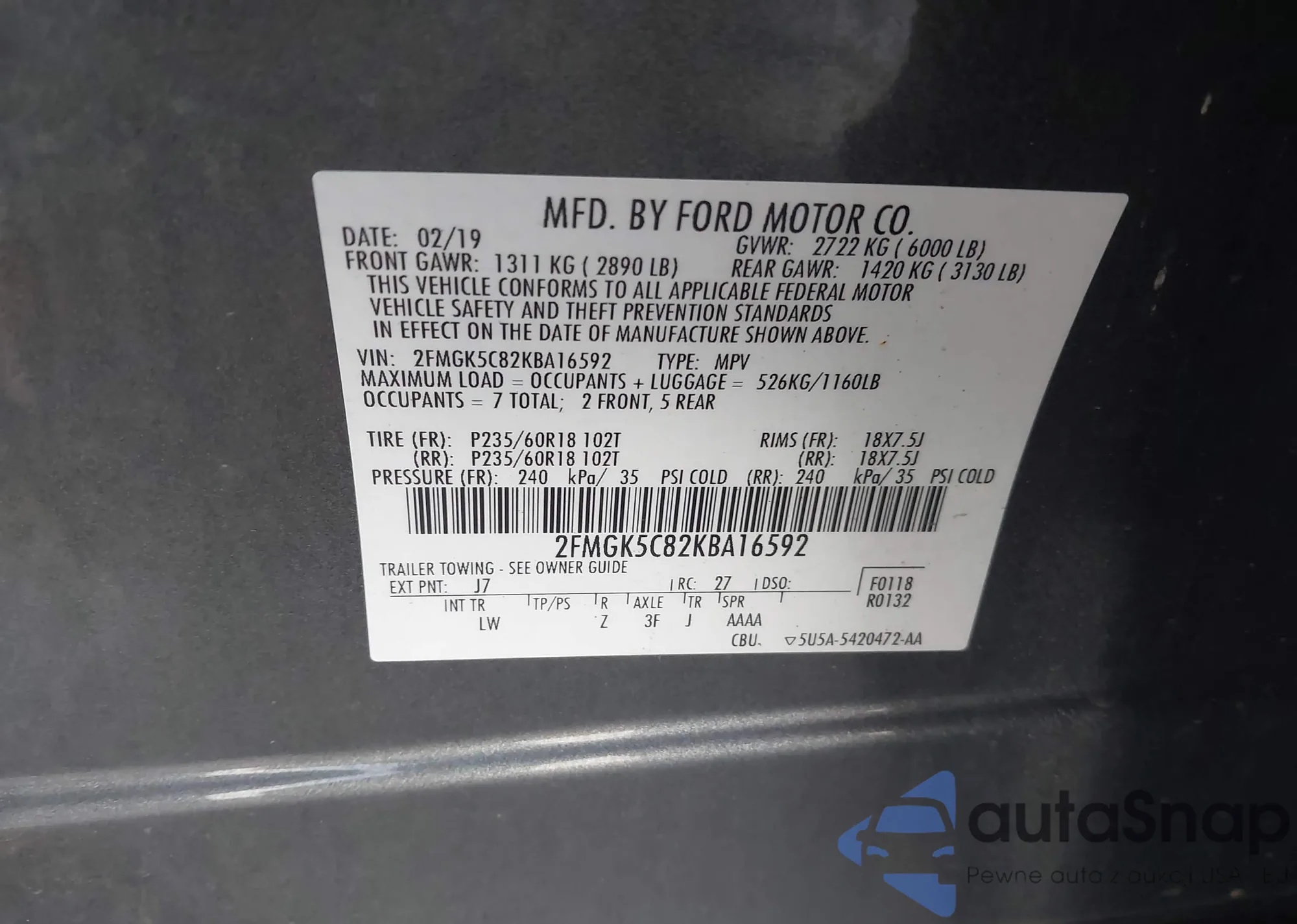 LOT: 44070945 VIN: 2FMGK5C82KBA16592
