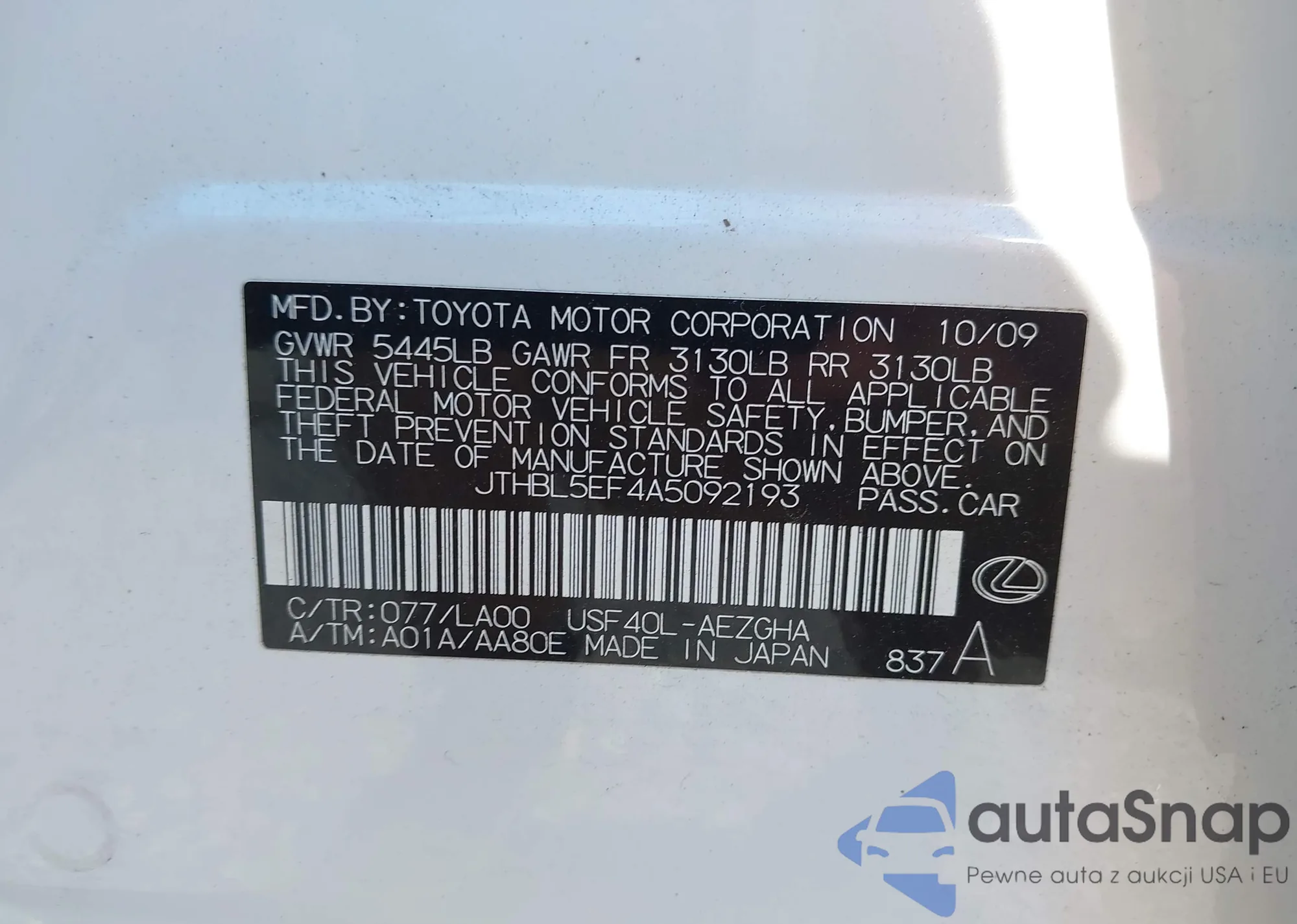 LOT: 44038448 VIN: JTHBL5EF4A5092193
