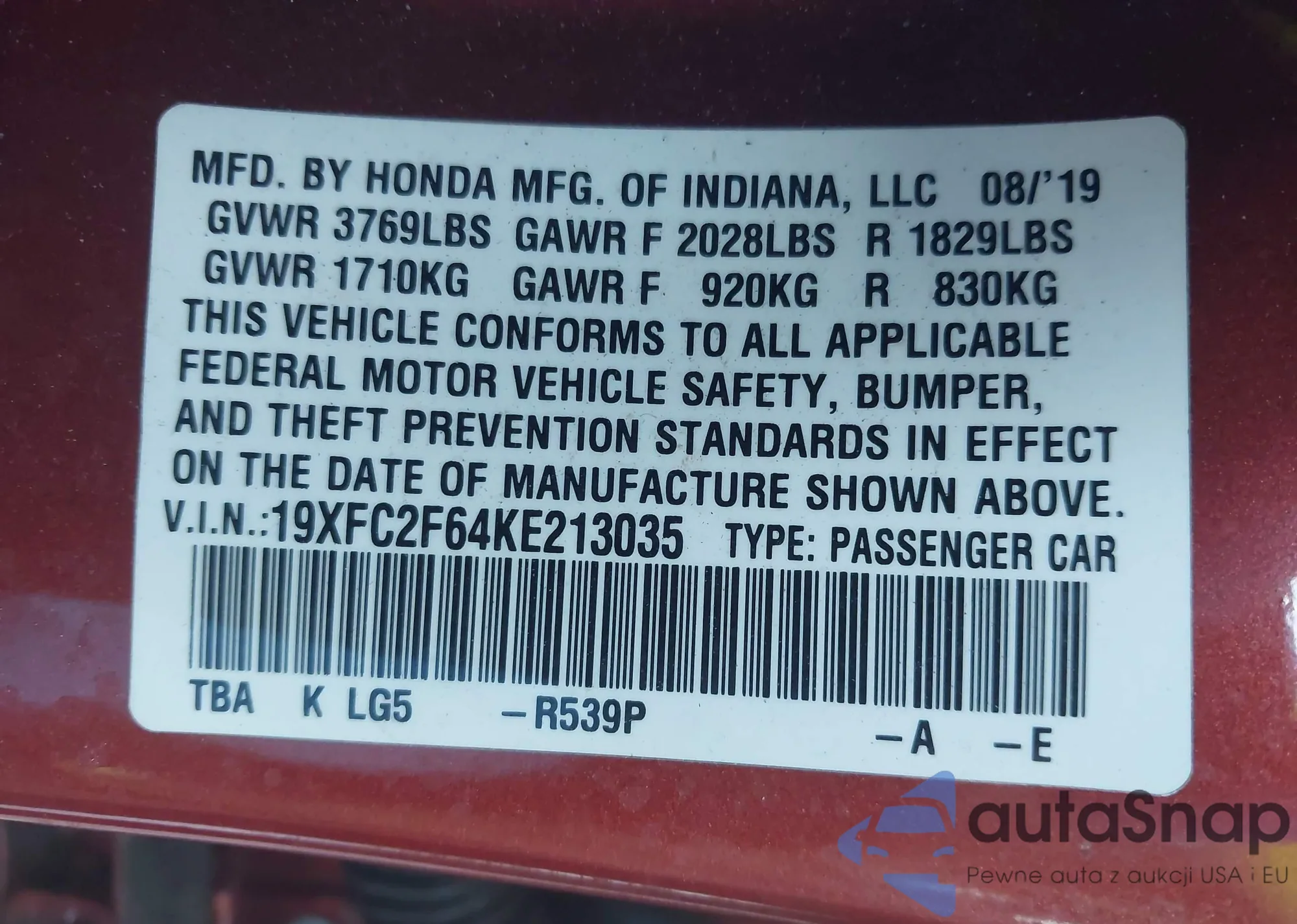 LOT: 43852322 VIN: 2HGFC3B30HH354877