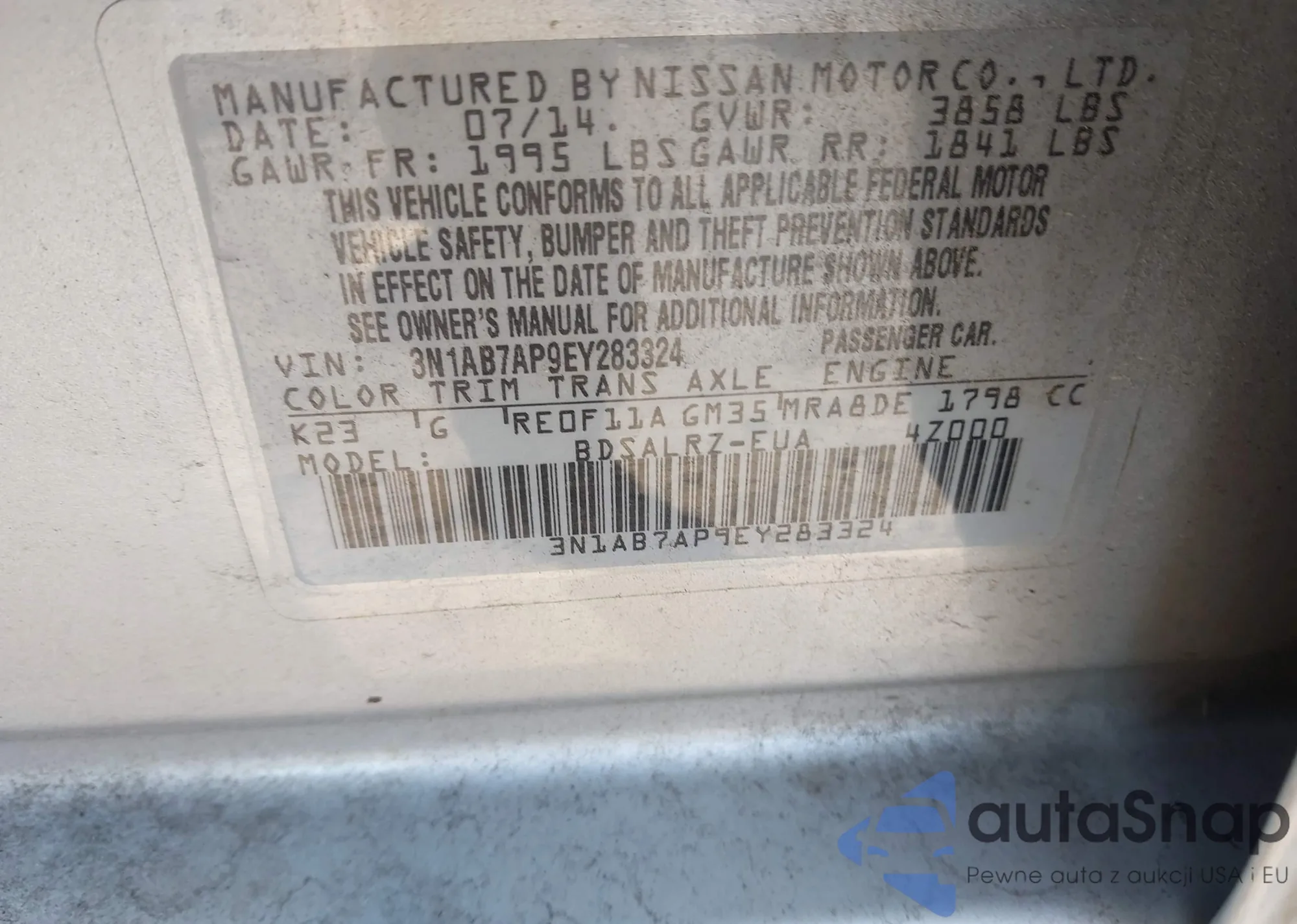 LOT: 44062739 VIN: 3N1AB7AP9EY283324