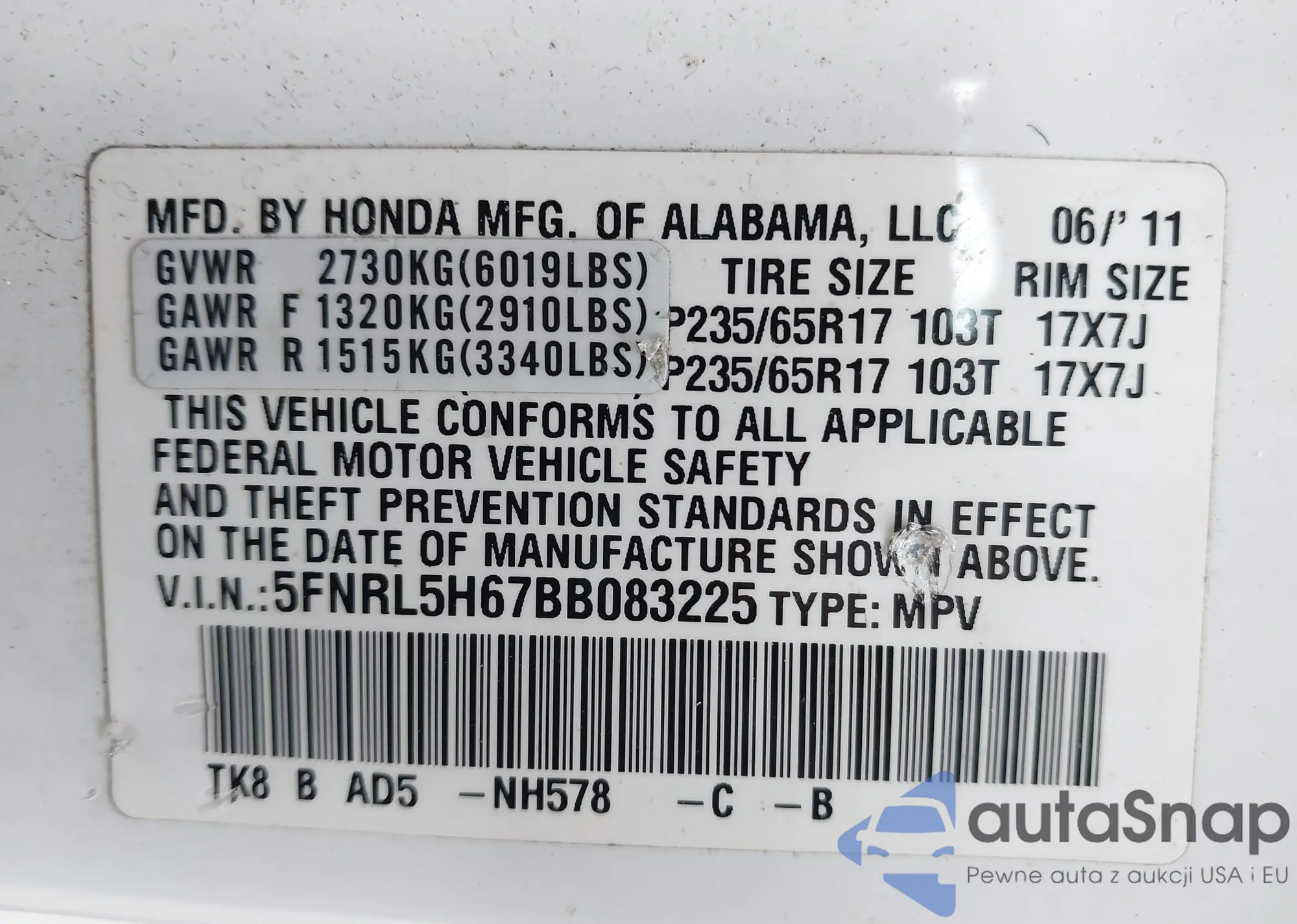 • VIN 5FNRL5H67BB083225