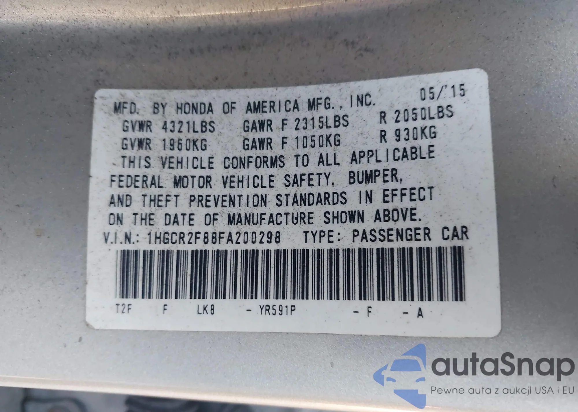 LOT: 43844803 VIN: 1HGCR2F88FA200298