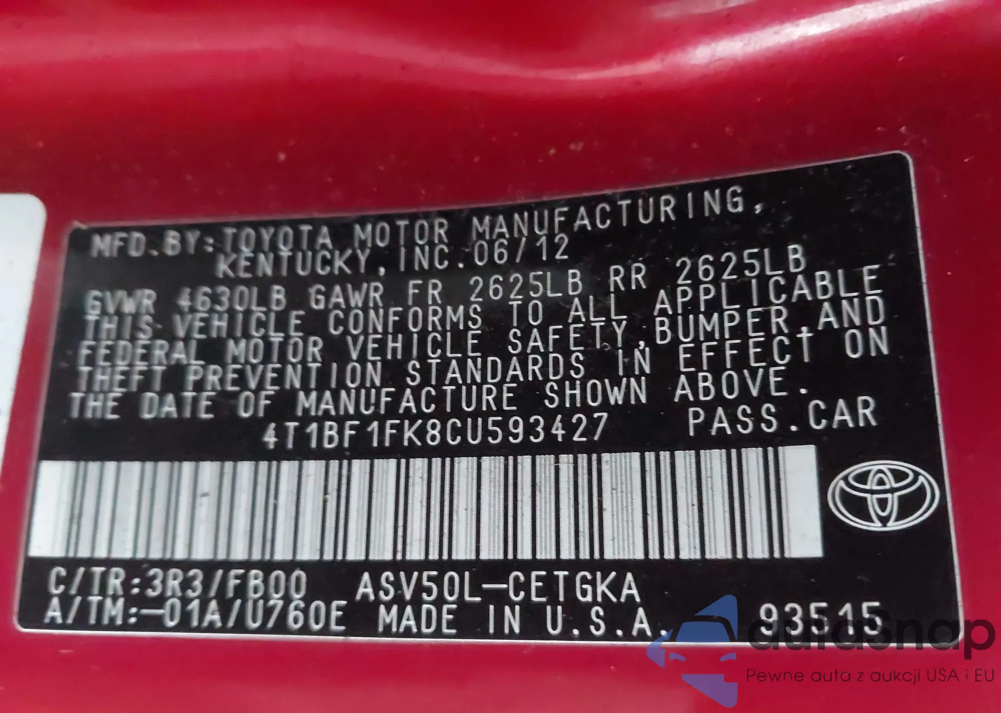 • VIN 4T1BF1FK8CU593427