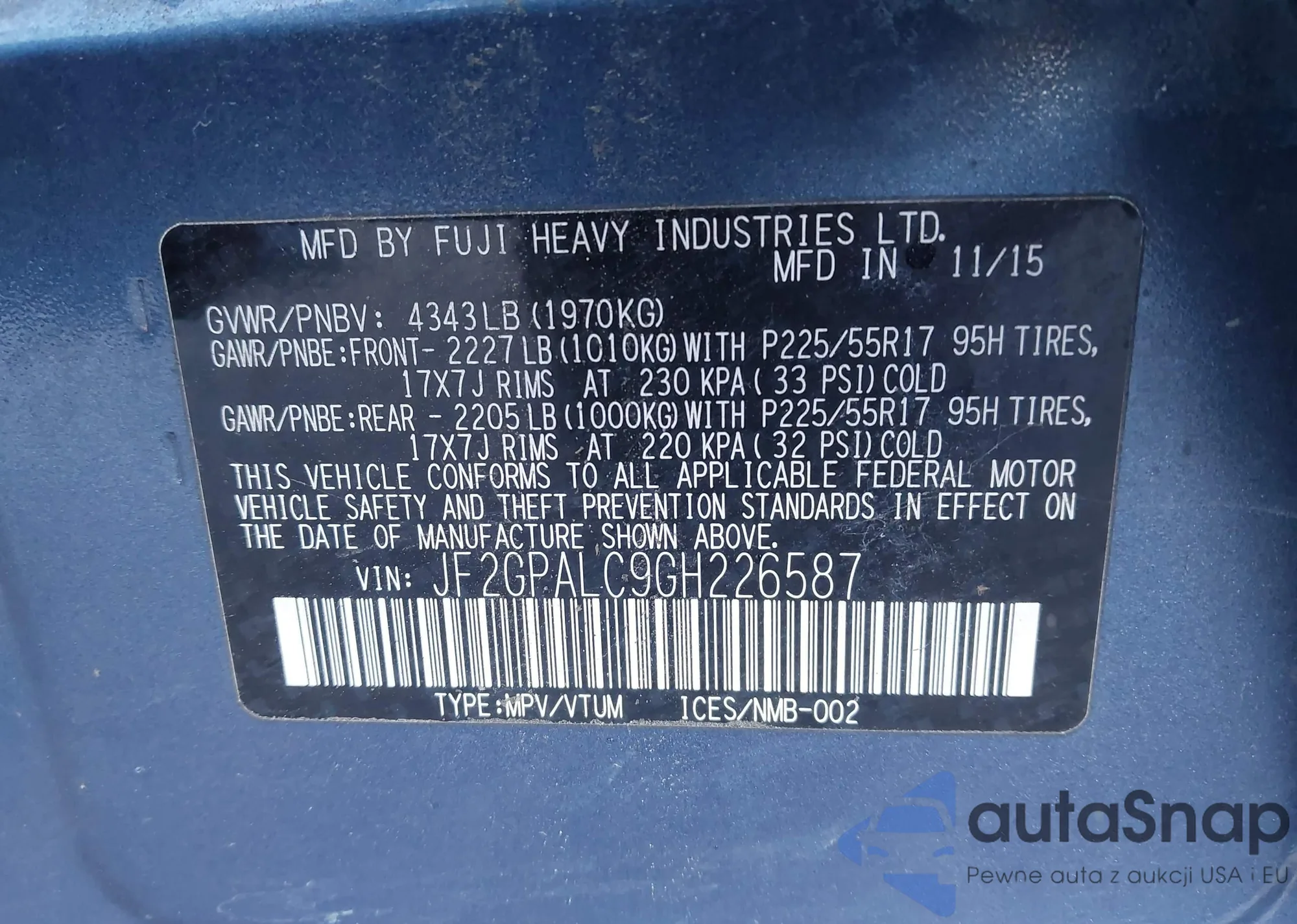 • VIN JF2GPALC9GH226587