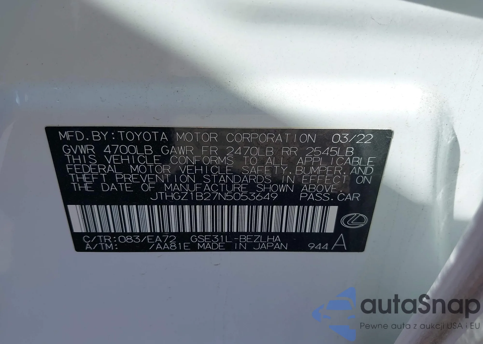 LOT: 44212281 VIN: JTHBF5C24C5178565