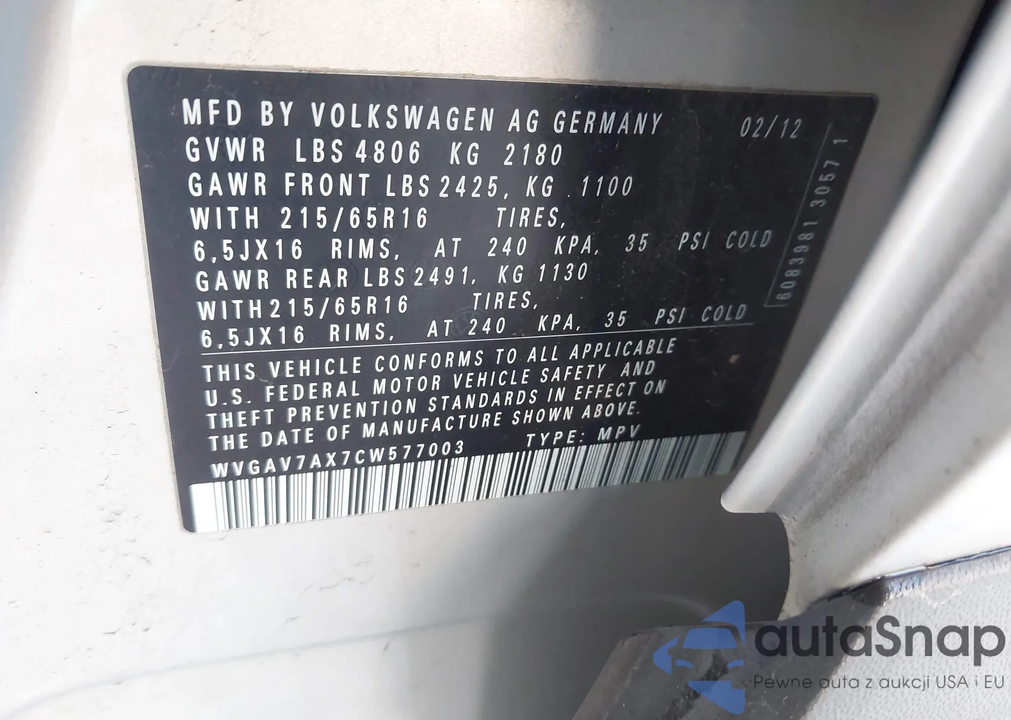 • VIN WVGAV7AX7CW577003