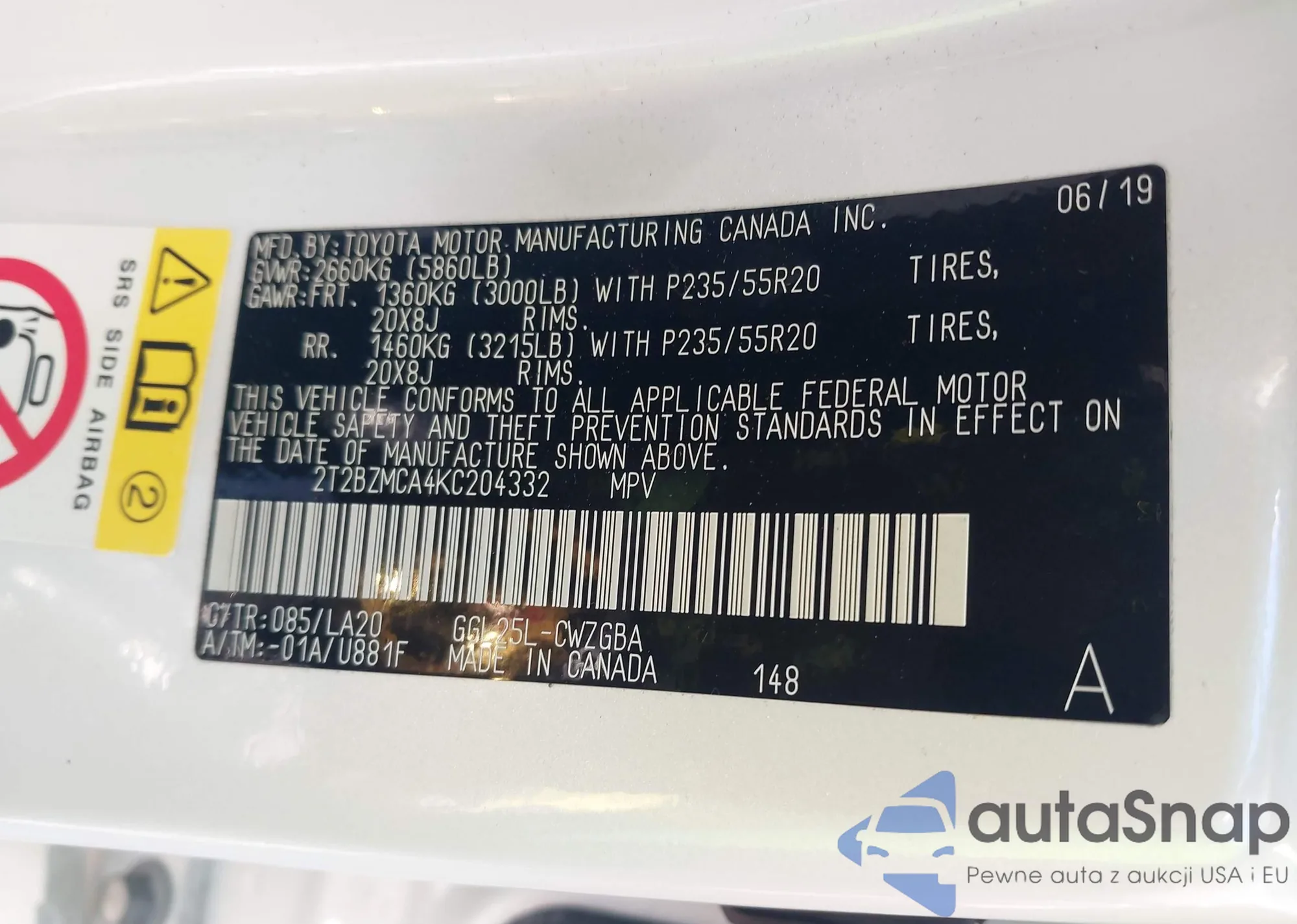 • VIN 2T2BZMCA4KC204332