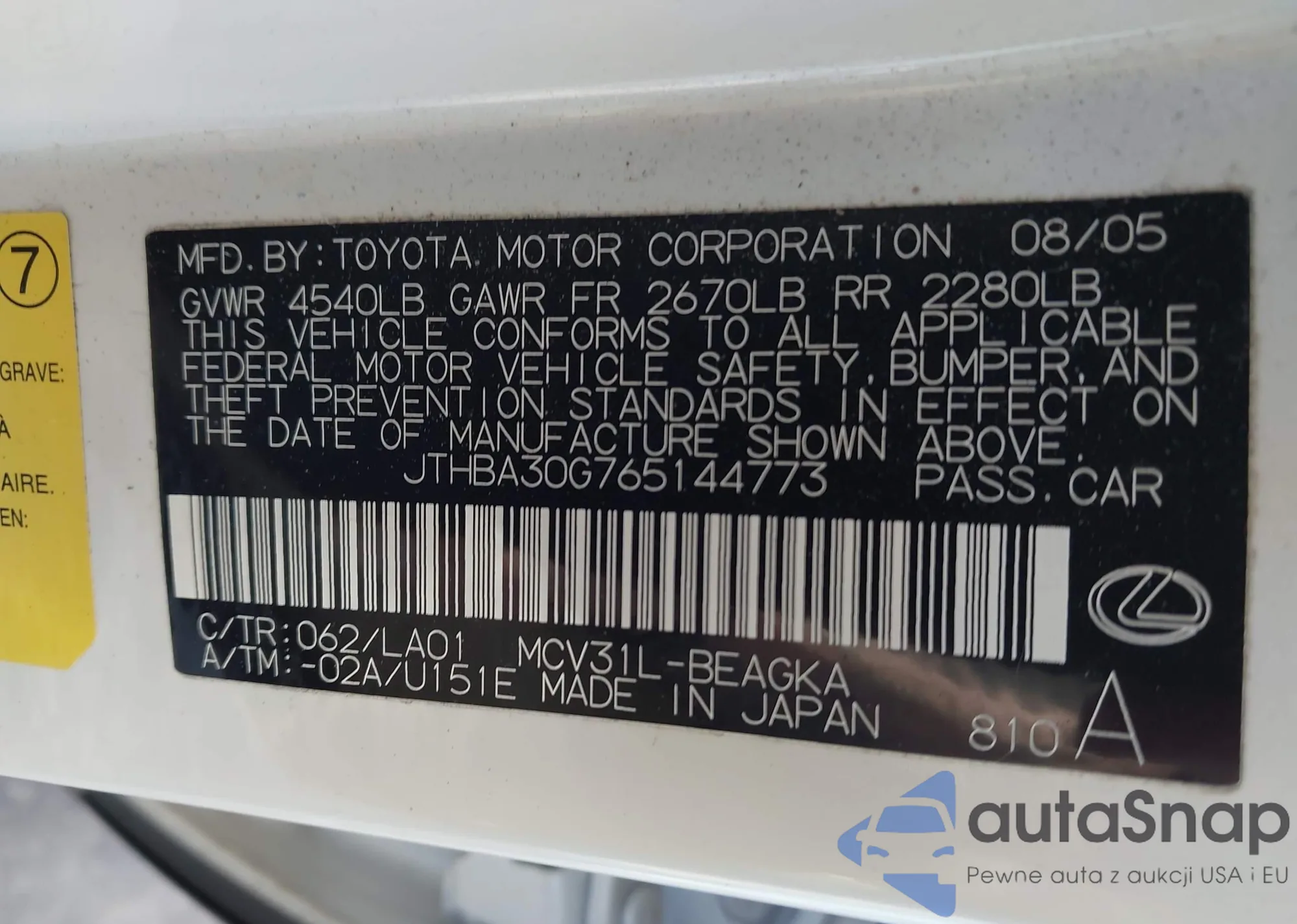 LOT: 43997250 VIN: JTHBA30G765144773