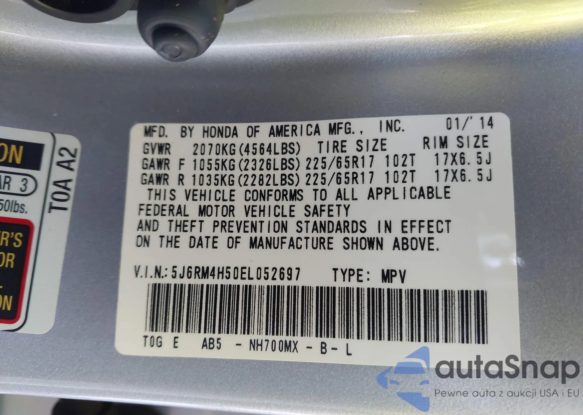 • VIN 5J6RM4H50EL052697