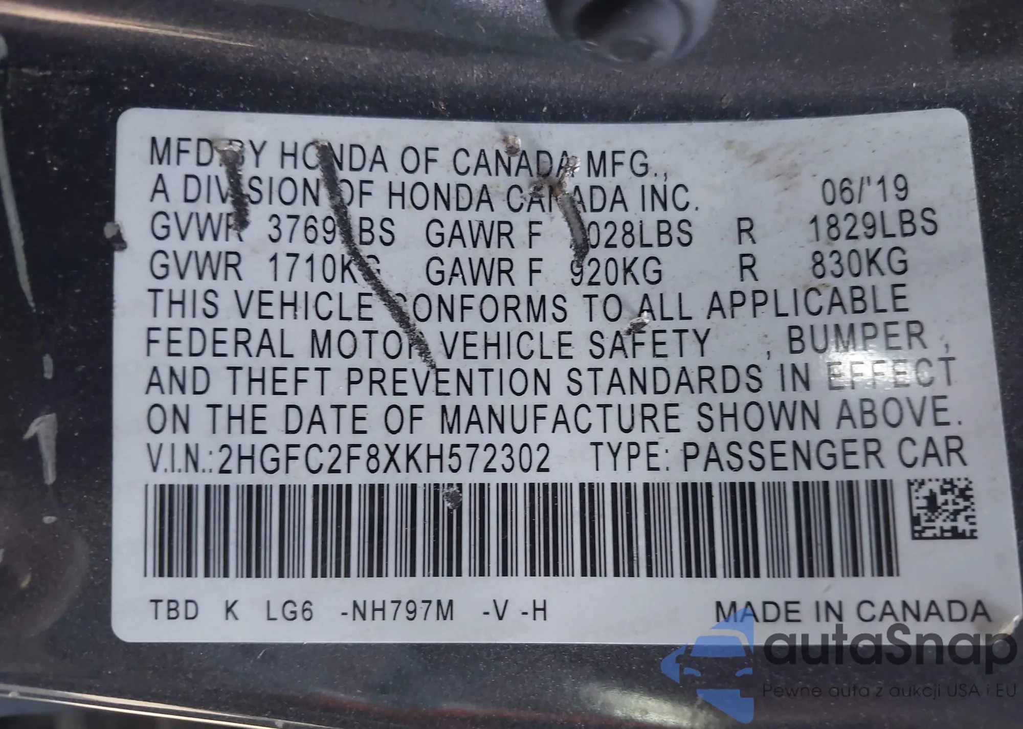 • VIN 2HGFC2F8XKH572302